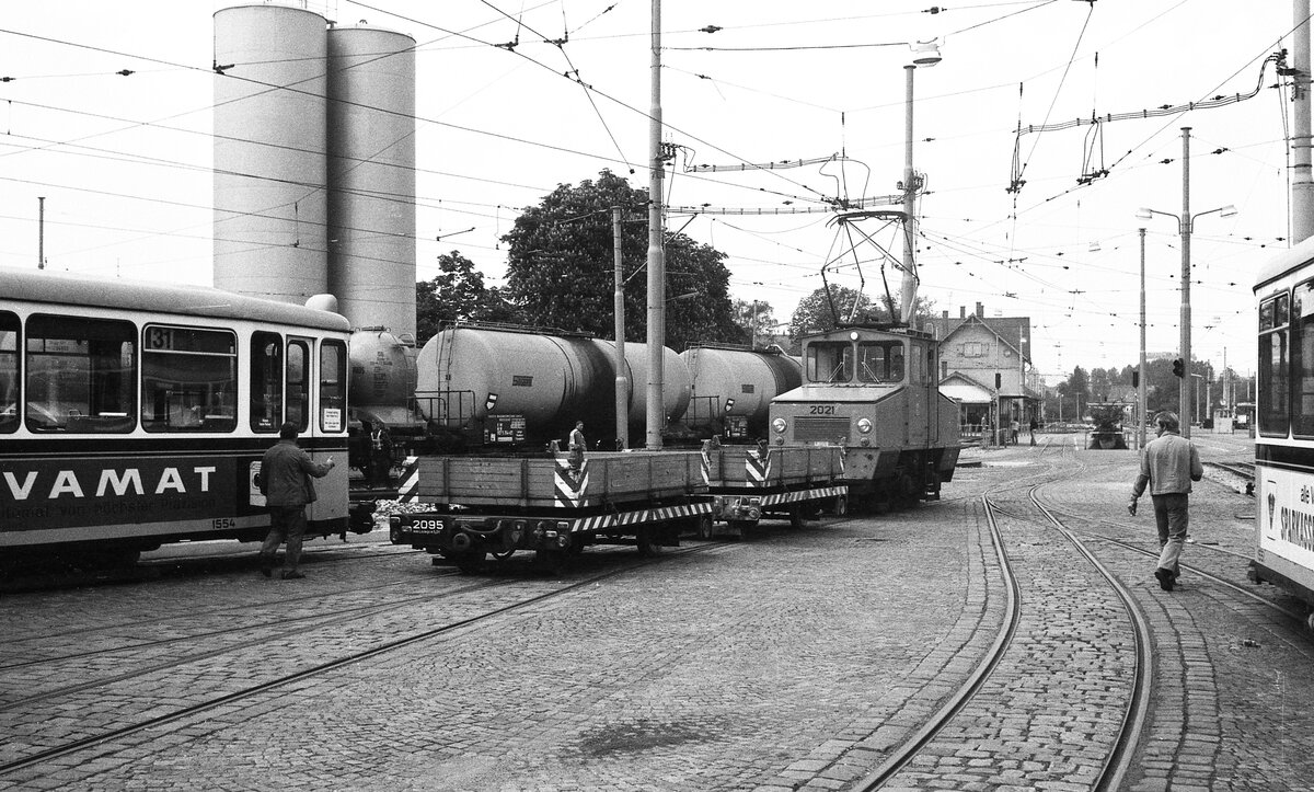 SSB Stuttgart__Arbeitsfahrzeuge der SSB in den 70er und 80er Jahren. A-Lok 2021 [ME/BBC 1946; +1995] mit zwei Schüttgutwagen passiert u.a. DoT4 924 neben der Degerlocher Wagenhalle. Zwei Monate zuvor, am 15.04.76 mußte die Feuerwehr den 924 am (bis dahin) ungesicherten Ende des Abstellgleises aus der Wiese ziehen. Er war rückwärts abwärts gerollt. Es gibt halt wenige waagrechte Gleisabschnitte in Stuttgart...__08-06-1976