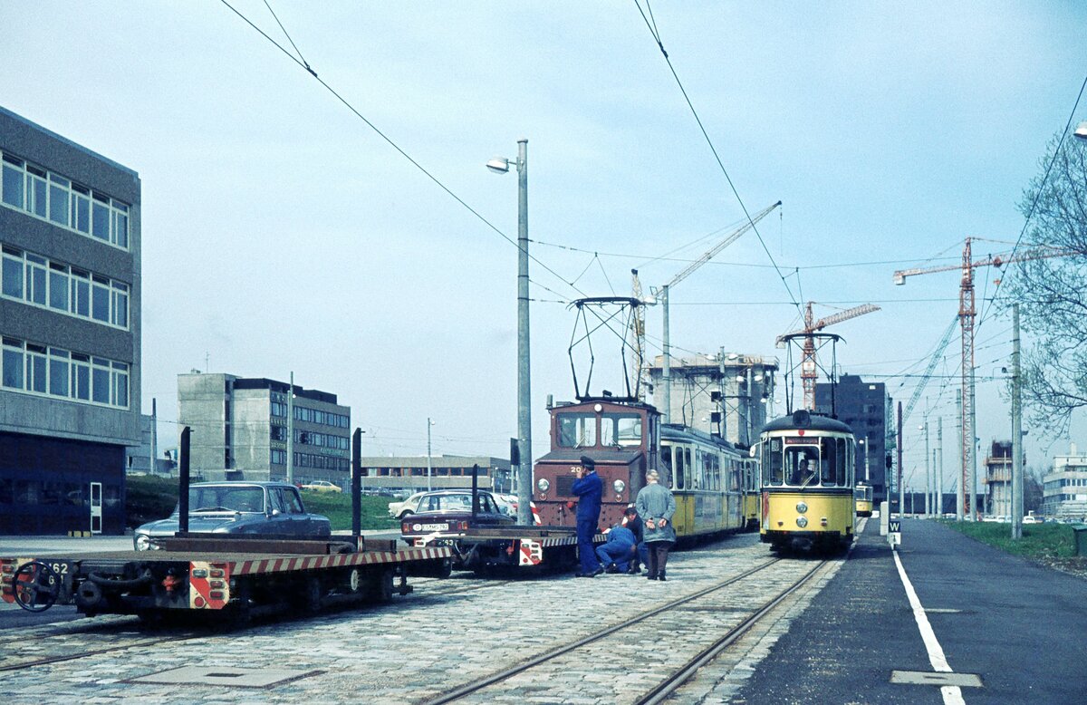 SSB Stuttgart__Arbeitsfahrzeuge der SSB in den 70er und 80er Jahren. Gleisbauhof in S-Wangen. Zu sehen ist der Flachwagen 2162 [1947; +1992].__22-05-1975