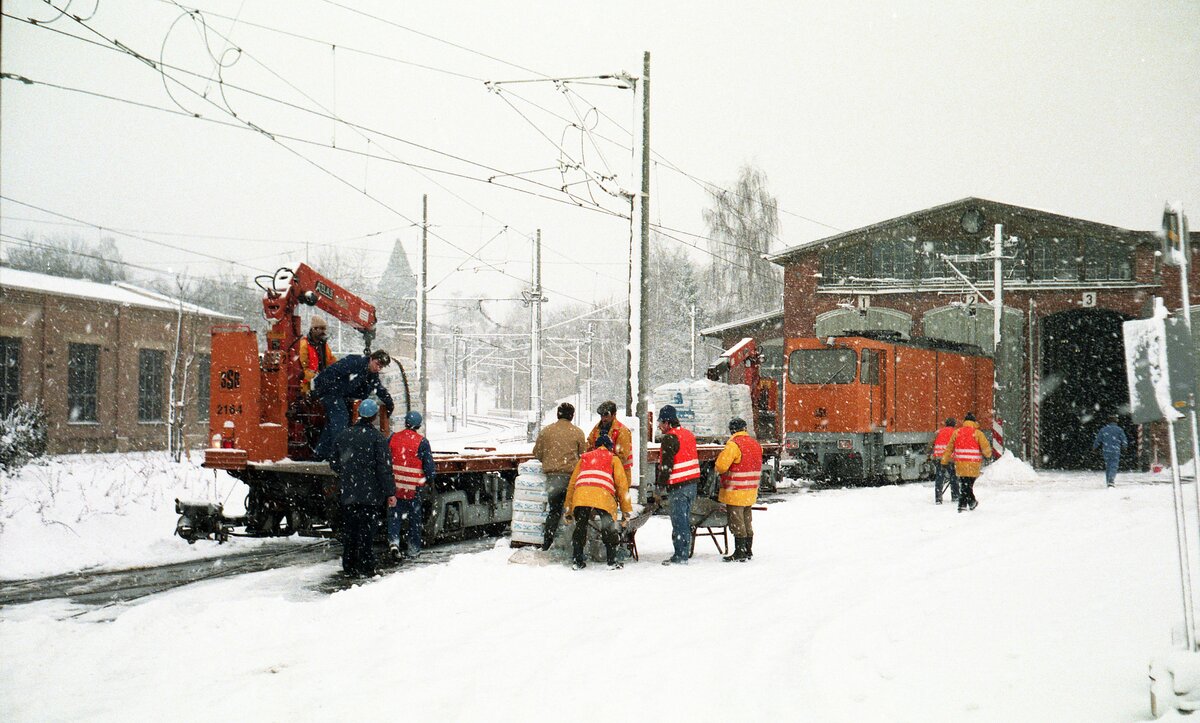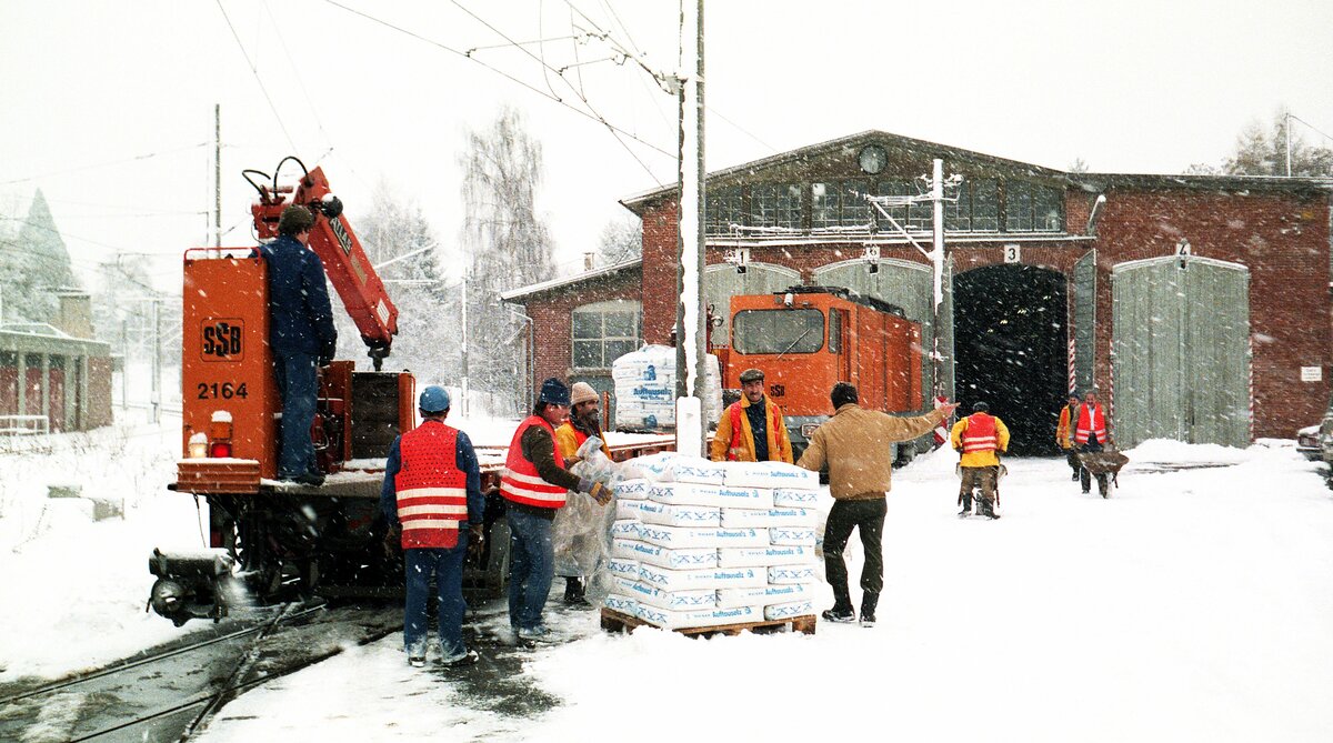 SSB Stuttgart__Arbeitsfahrzeuge der SSB in den 70er und 80er Jahren. 4x E-DE-Lok 2011 [Bj.1981; Kaelble-Gmeinder/Siemens] vor den ehemaligen Filderbahn Wagenhallen in S-Möhringen. Trotz modernster Technik > ABw 2164 (4x Schienentransporter mit Kran von DUEWAG, 1980) geht es nicht ohne Muskelkraft. Und Streusalz war in der Situation sehr gefragt... __22-12-1986