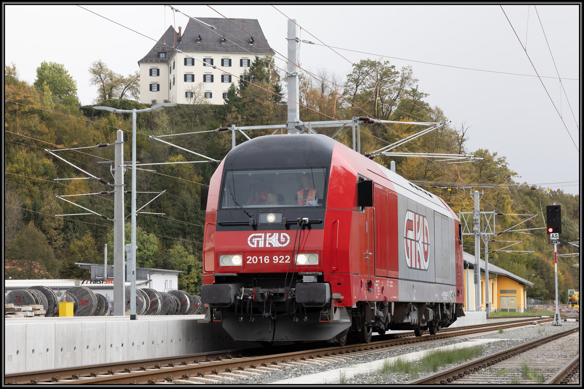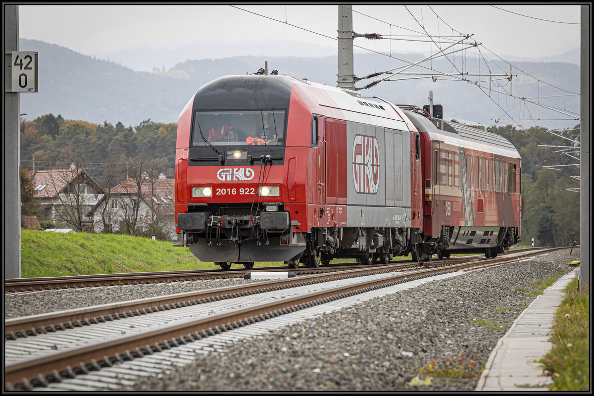 2016.922 erreicht etwas verspätet den Bahnhof St. Martin im Sulmtal Bergla am 24.Oktober 2023. Am Haken einen Messwagen um etwaige Fehler in der Gleislage zu erkennen.