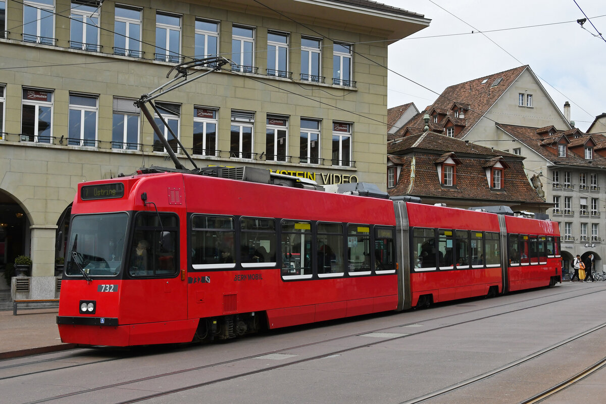 Be 4/6 Vevey Tram 732, auf der Linie 7, bedient am 17.04.2023 die Haltestelle Zytglogge beim Casinoplatz.