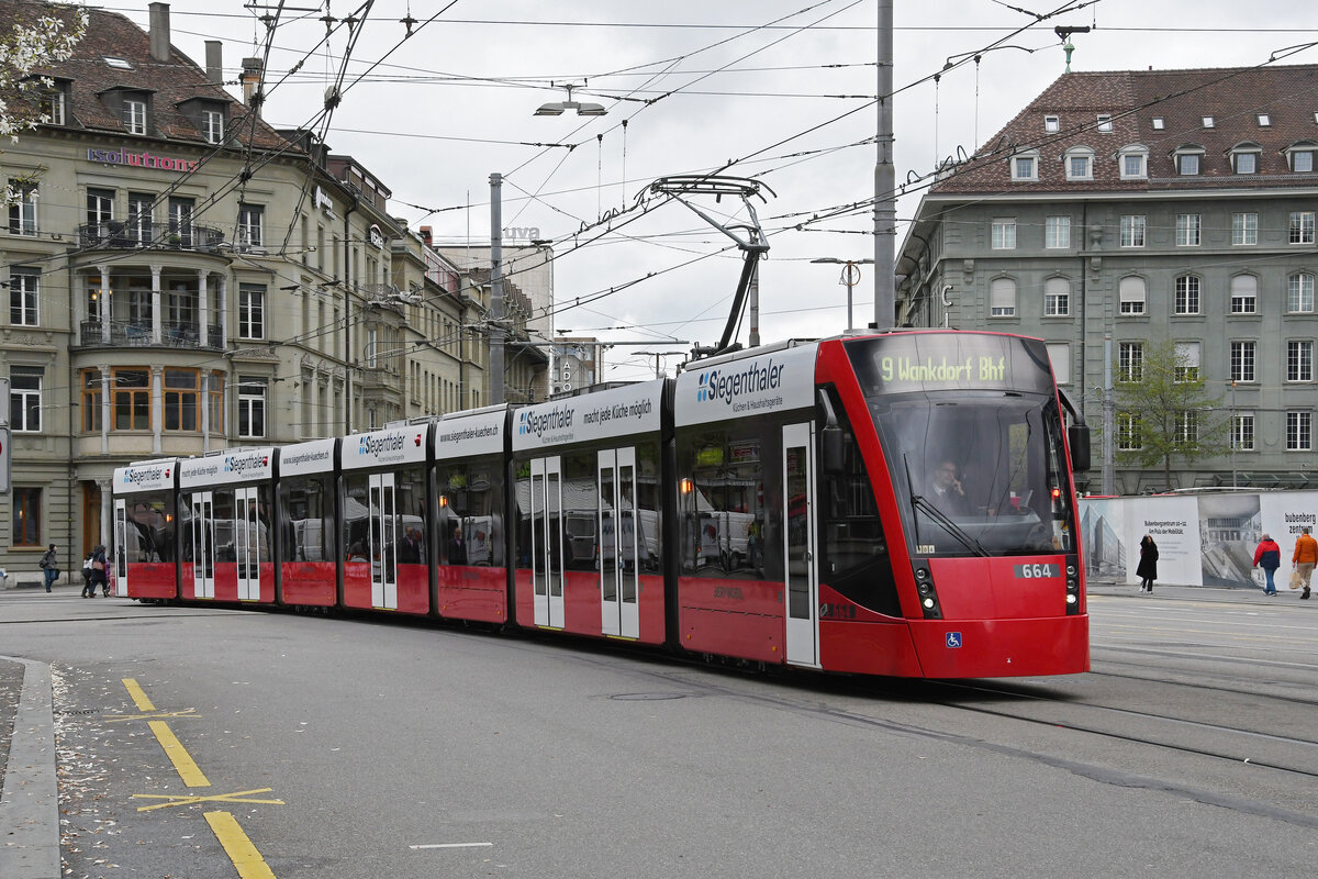 Be 6/8 Combino 664, auf der Linie 9, fährt am 17.04.2023 zur Haltestelle beim Bahnhof Bern.