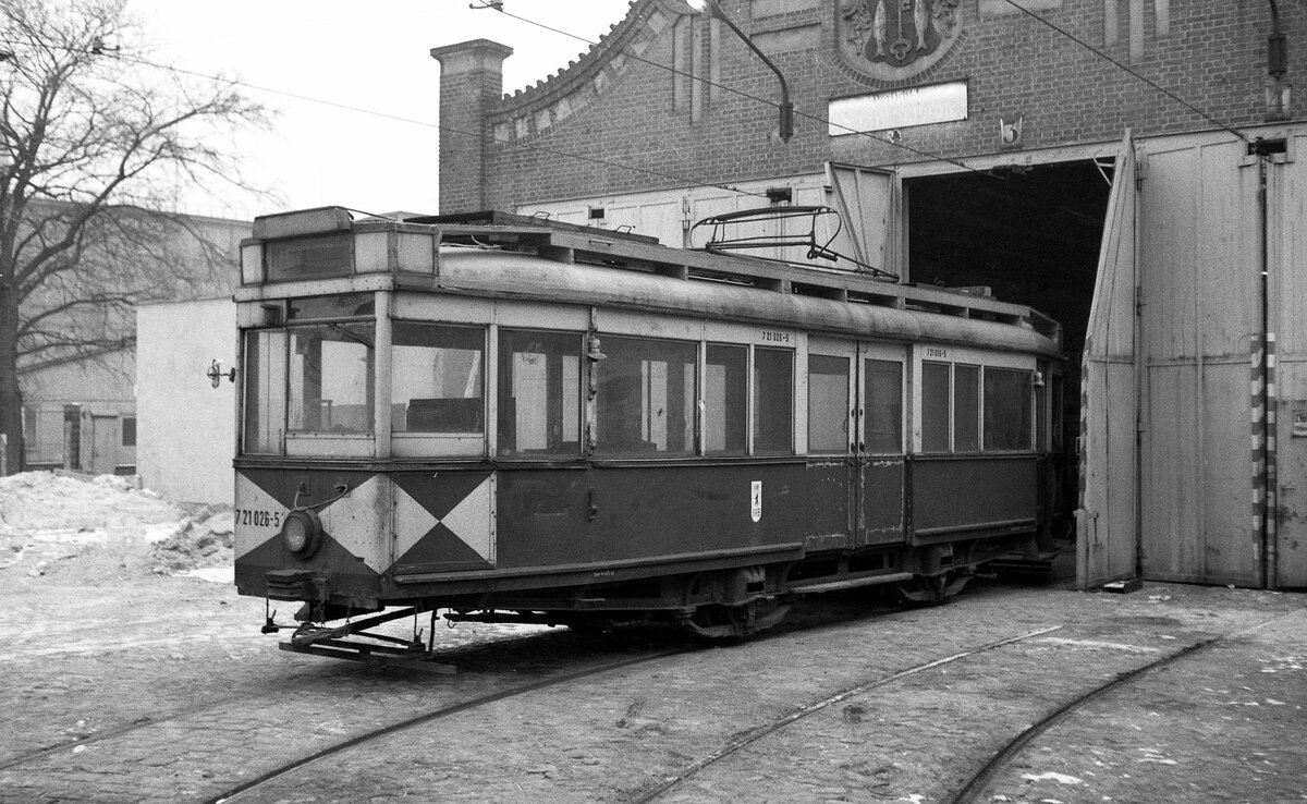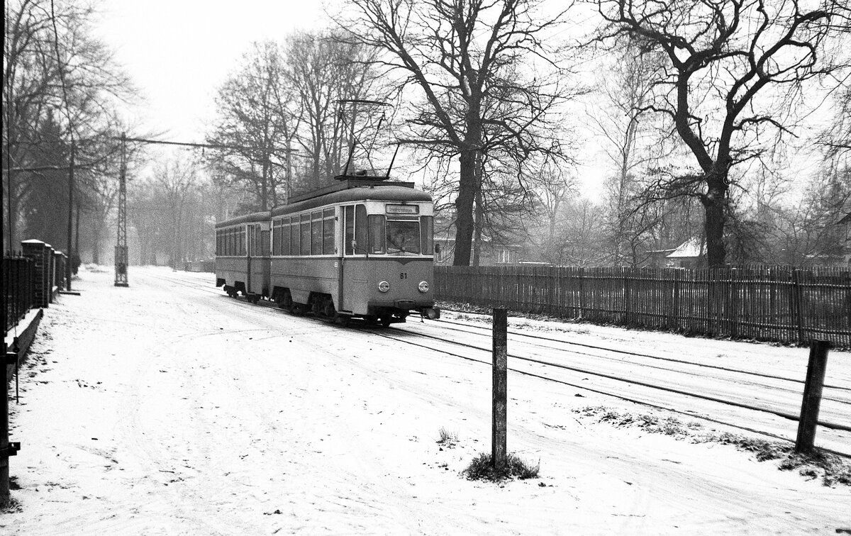 Straßenbahn Schöneiche-Rüdersdorf__Drei-Wagenzug mit Reko-Tw 75 [TZ70; RawSw 1975; 2003 >Istanbul] fährt Richtung Rüdersdorf.__Jan. 1978