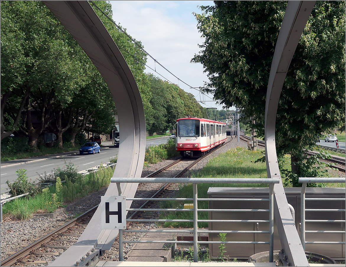 Die Dortmunder U47 im Westfalendamm - Östlich der Haltestelle Hauptfriedhof verlässt die Stadtbahntrasse den Mittelstreifen des Westfalendamm und biegt nach Süden ab. Seit 2016 ein kurzer Tunnel in Betrieb ging, können die Stadtbahnzüge die stadtauswärts führende Fahrbahnen der Schnellstraße niveaufrei kreuzen. Die weitere verläuft dann in Richtung Süden auf teilweise eingleisiger Führung nach Aplerbek. 21.08.2023 (M)