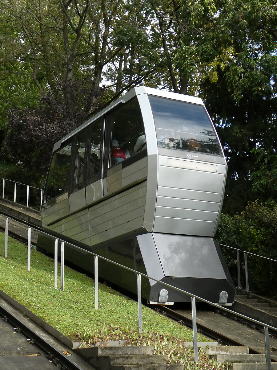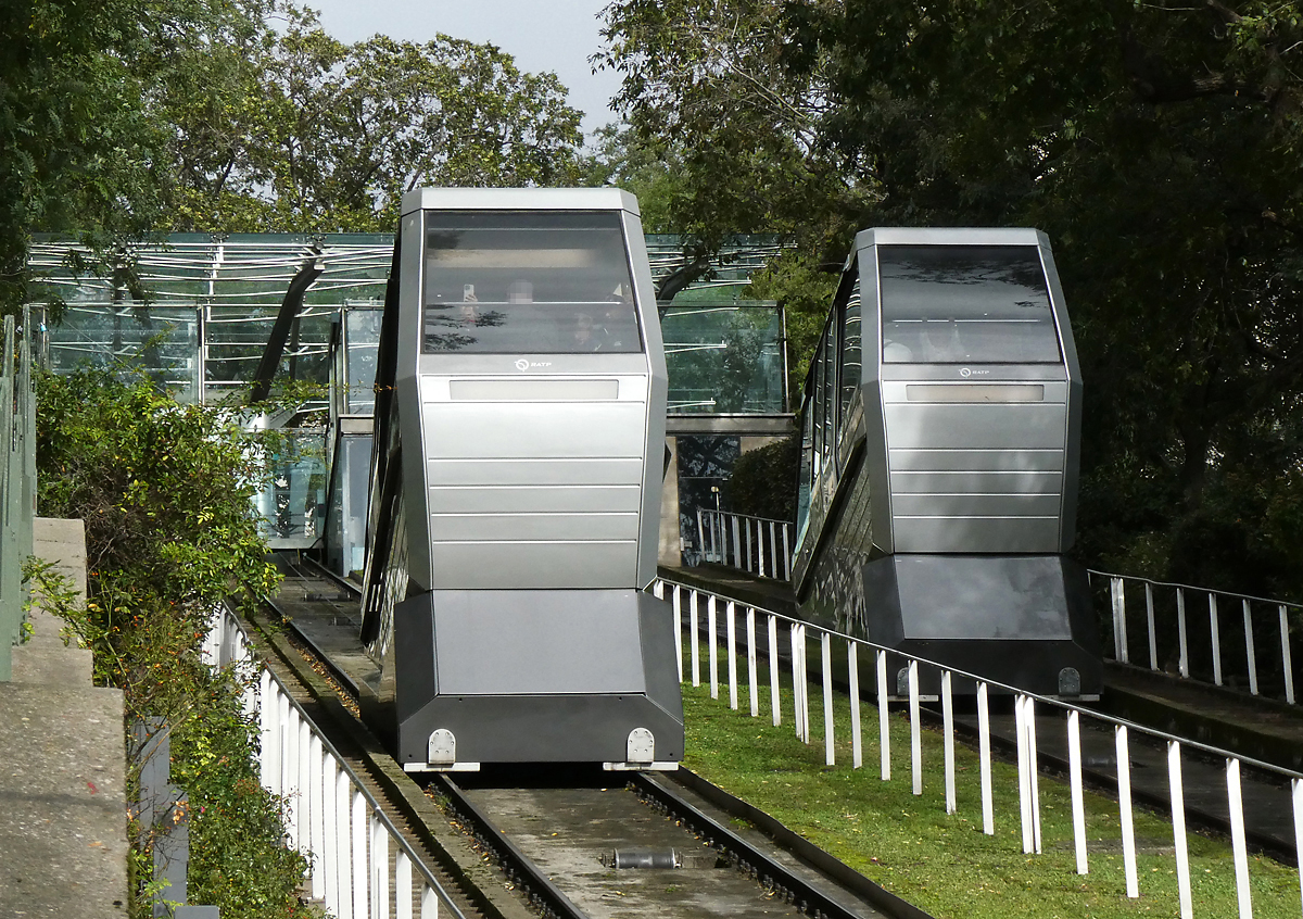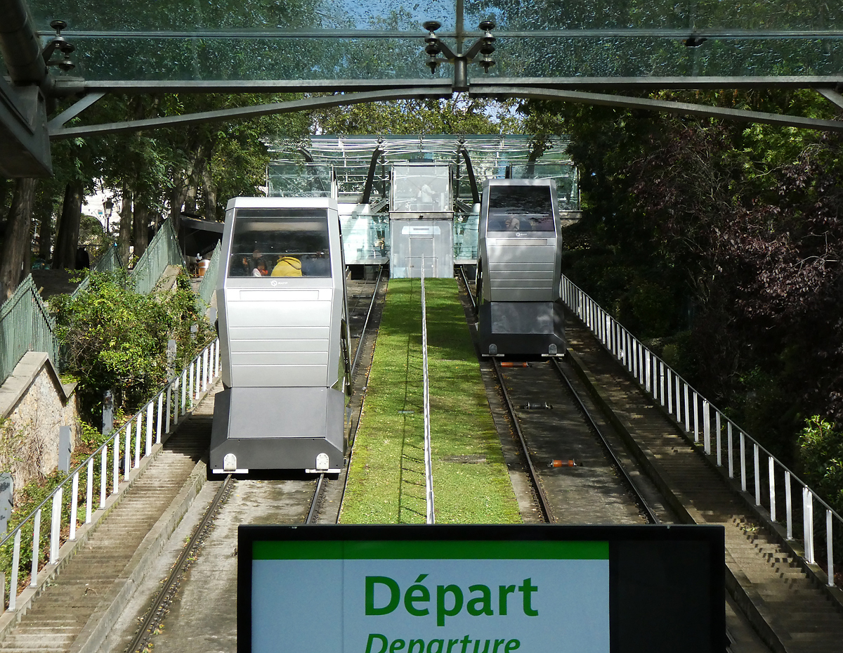 Die Funiculaire de Montmartre in Paris führt auf den Montmartre-Hügel und damit auch zur Basilika Sacré-Coeur, Streckenlänge 108m, Höhenunterschied 36m. Paris Montmartre, 22.10.2023