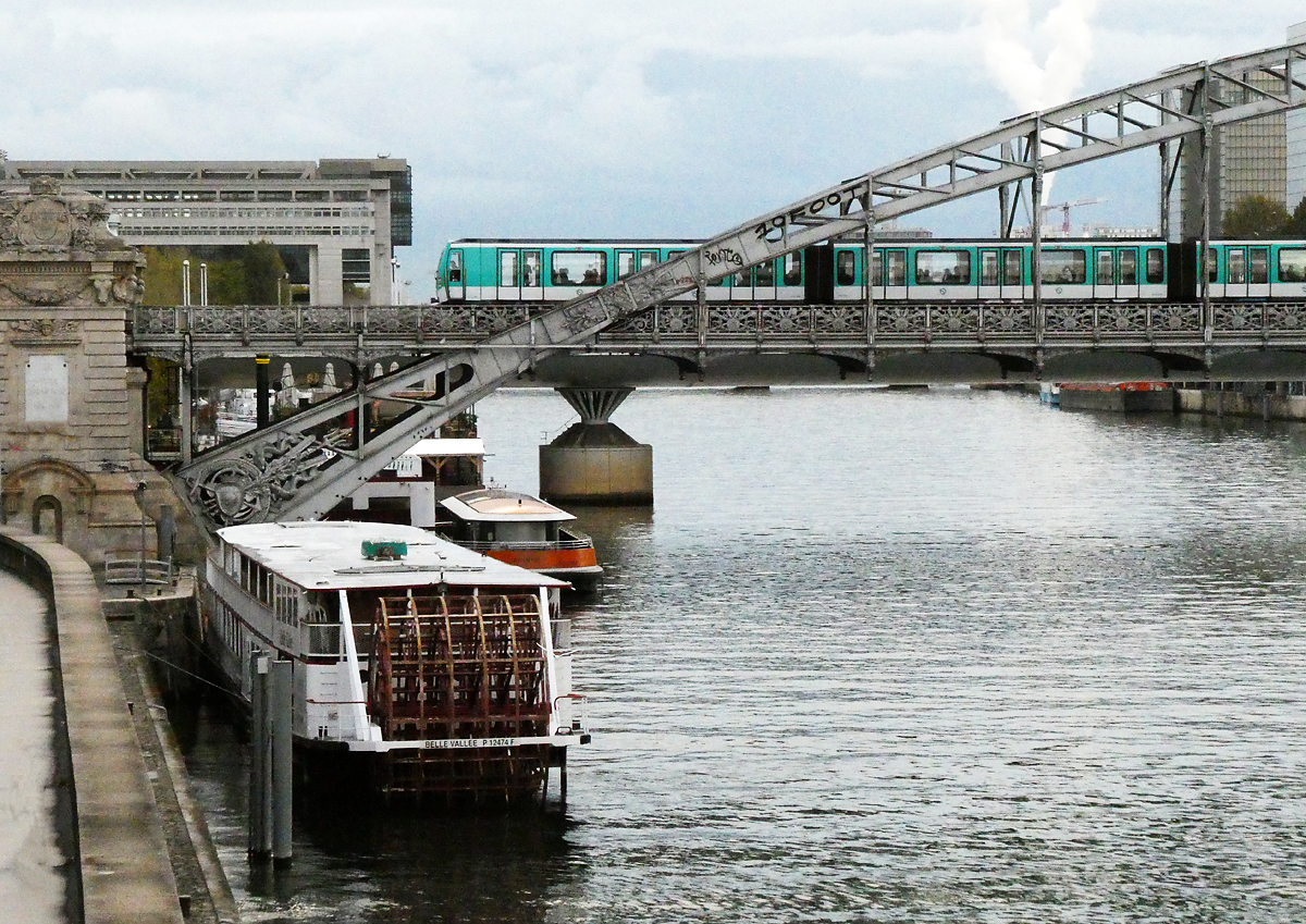 Pariser Metro der Linie 5 überquert die Seine auf dem Viaduc d' Austerlitz in der Nähe des Gare d' Austerlitz. Paris, 20.10.2023