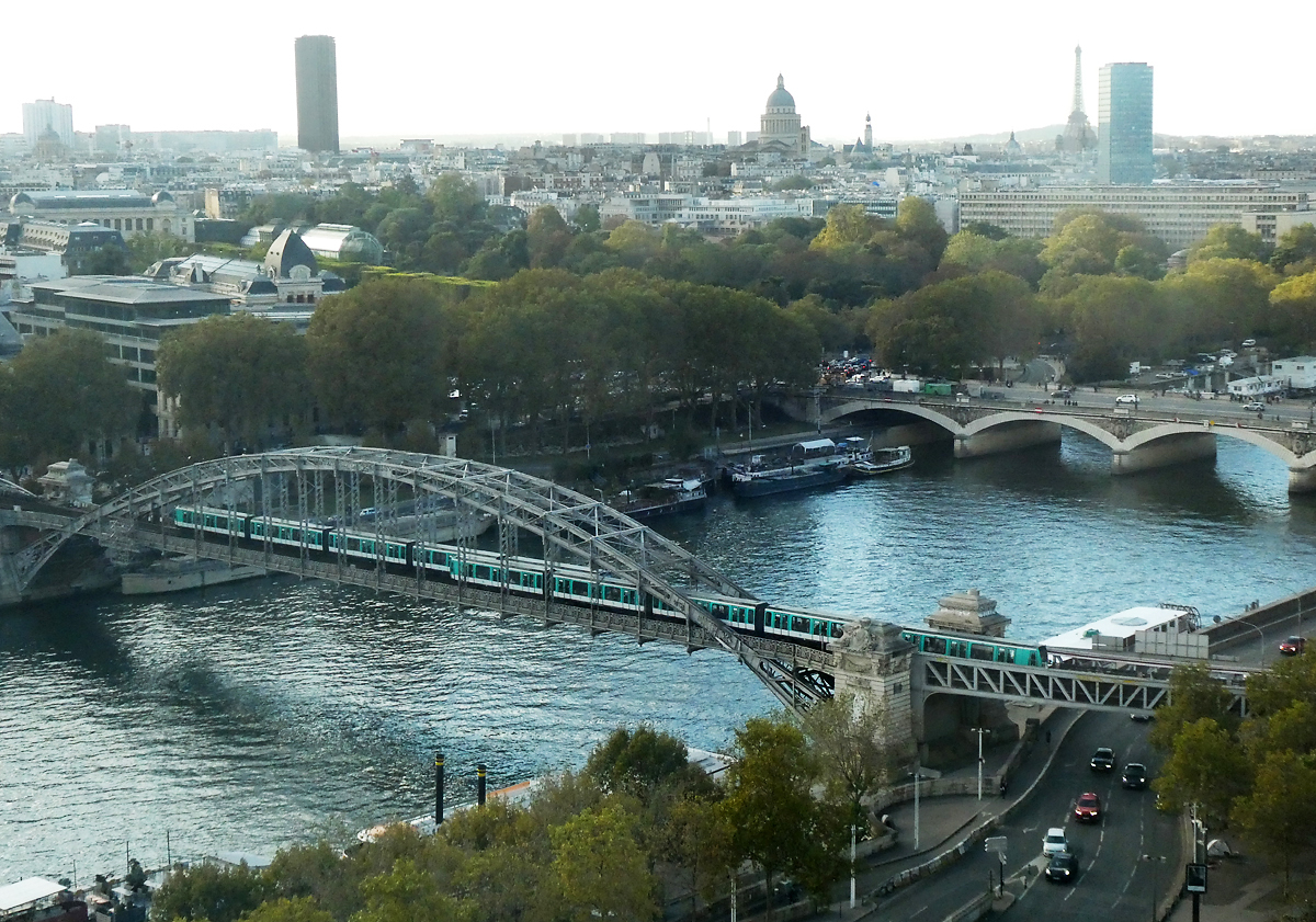 Zwei Züge der Pariser Metro Linie 5 überqueren die Seine auf dem Viaduc d' Austerlitz in der Nähe des Gare d' Austerlitz. Das Foto wurde von der 16. Etage eines Hotels aus aufgenommen. Paris, 22.10.2023
