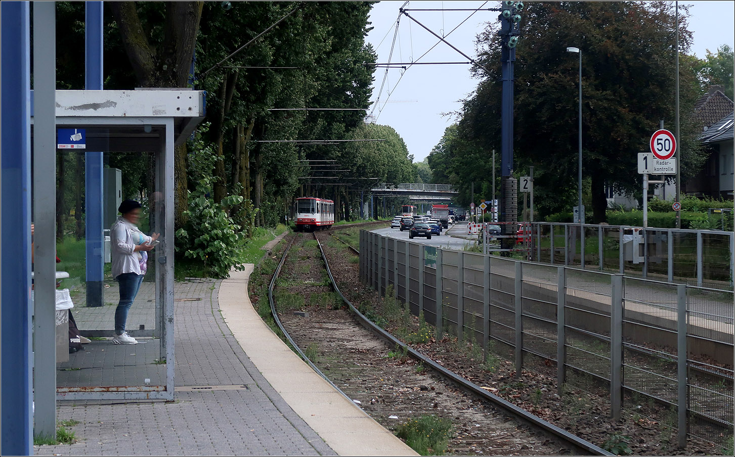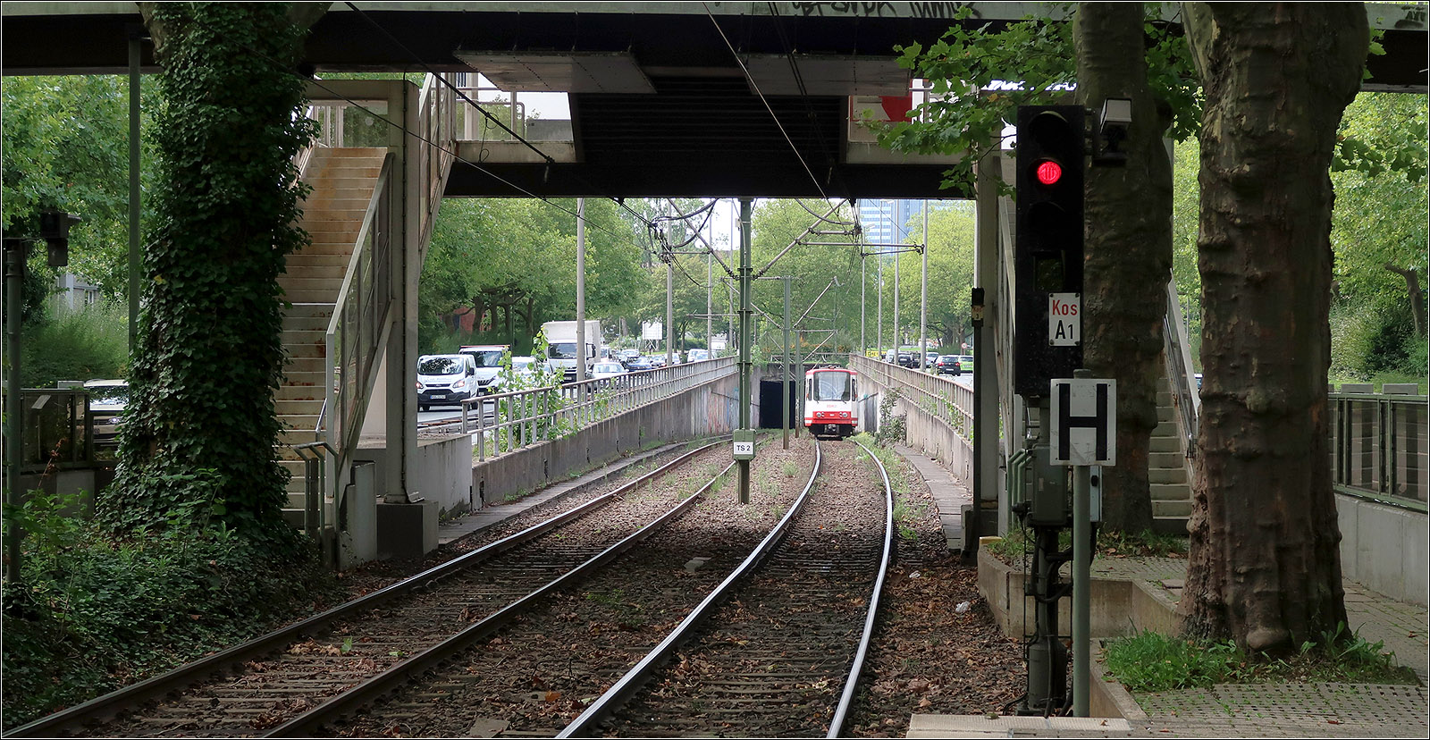 Die Gleise liegen auf der Südseite des breiten Mittelstreifen des Westfalendammes. Die weitere Fläche des Mittelstreifen wird durch einen schönen Baumbestand geprägt. Es ist zu hoffen, dass dieser im Falle des Ausbaues der Bundesstraße erhalten wird.