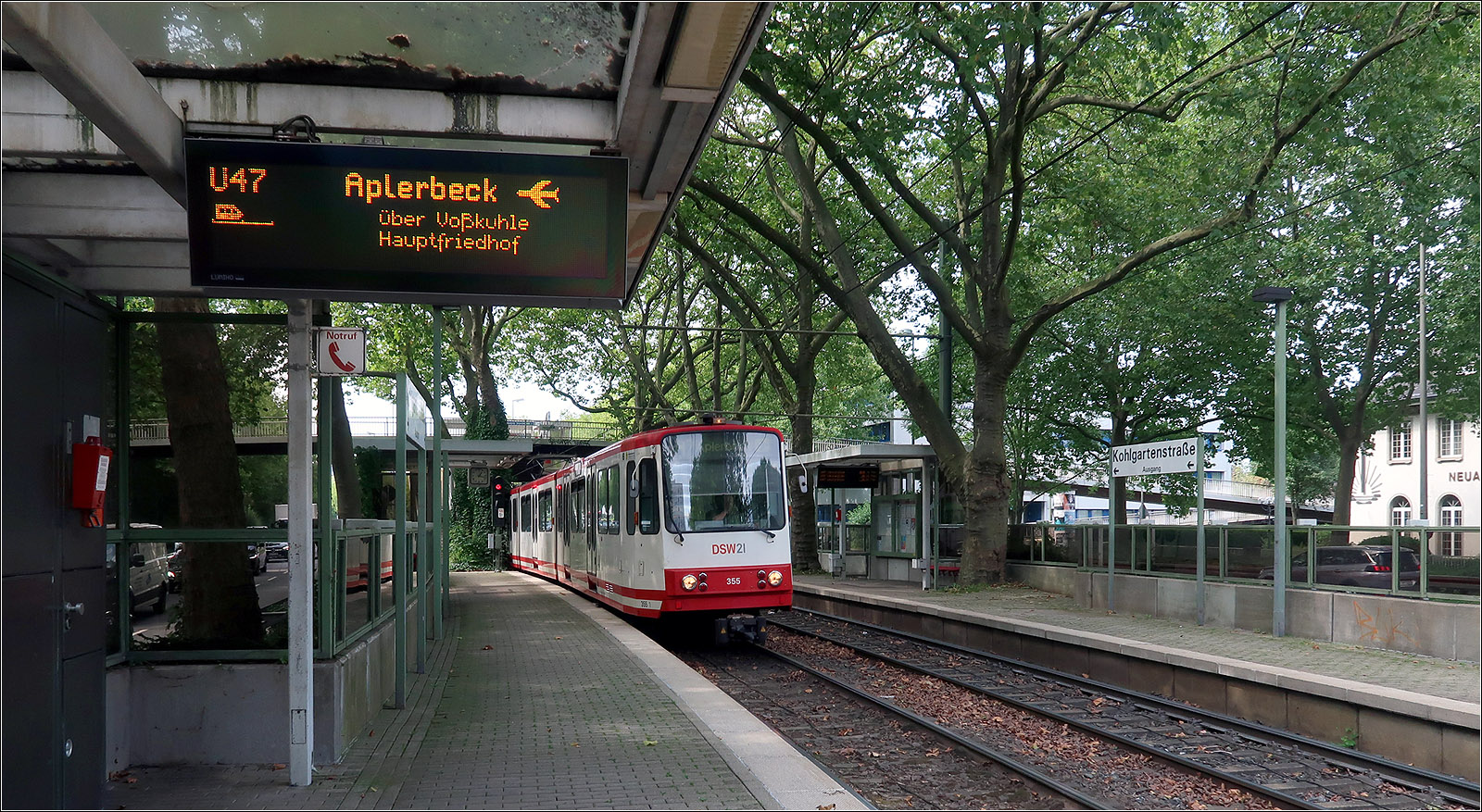 Die Dortmunder U47 im Westfalendamm - Die meisten Haltestellen entlang des Westfalendammes sind noch nicht mit Hochbahnsteigen ausgerüstet. Dies sollte im Zusammenhang mit dem Ausbau der Bundesstraße geschehen. Wenn ich es richtig verstanden habe, verzögert sich dieser Ausbau und der stadtbahngerechte Ausbau der Haltestellen soll unabhängig davon geschehen. Im Bild B80C an der inmitten von Bäumen liegende Haltestelle Kohlgartenstraße. 21.08.2023 (M)