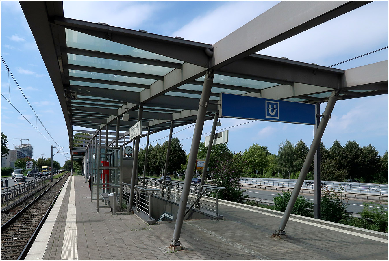 Die Dortmunder U47 im Westfalendamm - Die Haltestelle Hauptfriedhof wurde 2003 kreuzungsfrei und stadtbahngerecht ausgebaut. Die Station erhielt eine aufwändige Stahl-Glas-Konstruktion die sich als lang gezogener Bogen in Längsrichtung über den Bahnsteig spannt. 21.08.2023 (M)