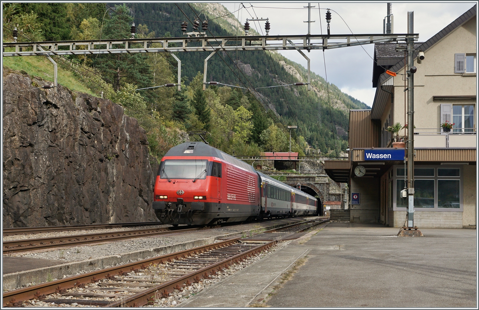 Die SBB Re 460 034 ist mit ihrem EC 10156 in Wassen auf dem Weg von Lugano nach Basel SBB.