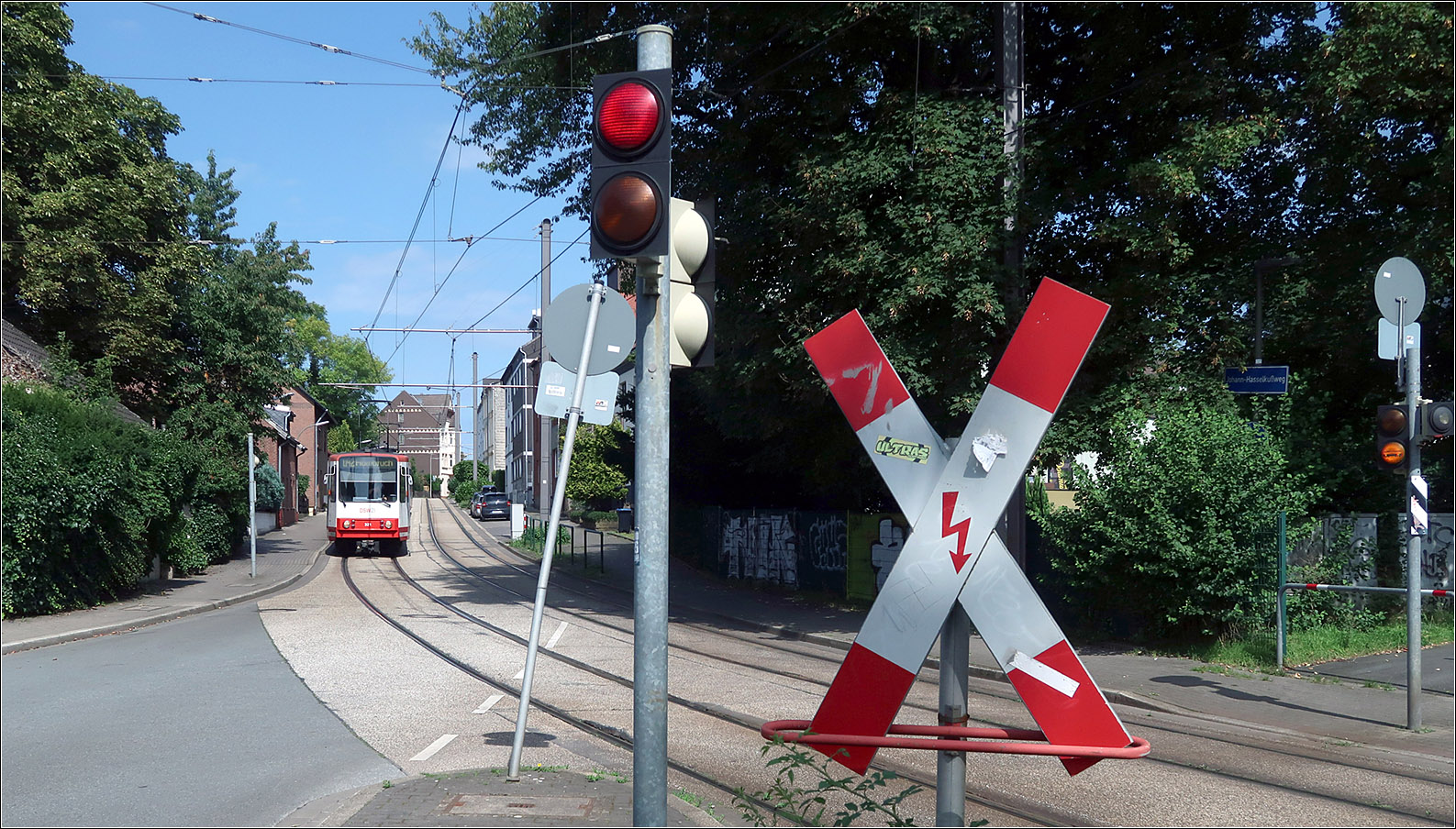 Hier blickt man in den kurzen straßenbündigen Abschnitt der U42 im Krückenweg. Nach rechts schließt sich ein kurzer kreuzungsfreier Streckenabschnitt an mit der Haltestelle Barop Parkhaus in Tieflage.