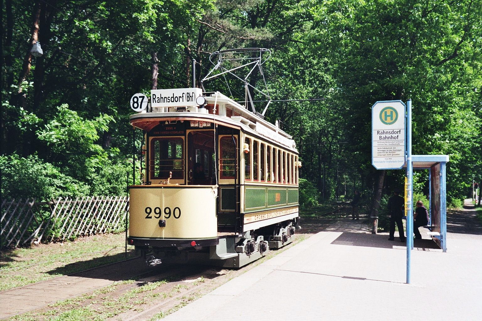 Woltersdorfer Straßenbahn__Durch den Wald ... Maximum-Tw 2990 von Woltersdorf kommend kurz vor Rahnsdorf. Im Vergleich zu den meisten Fahrzeugen in der zweiten Hälfte des 20. Jahrhunderts hatten sie damals wirklich gut lesbare Ziel- und Linientafeln ... __23-05-2009