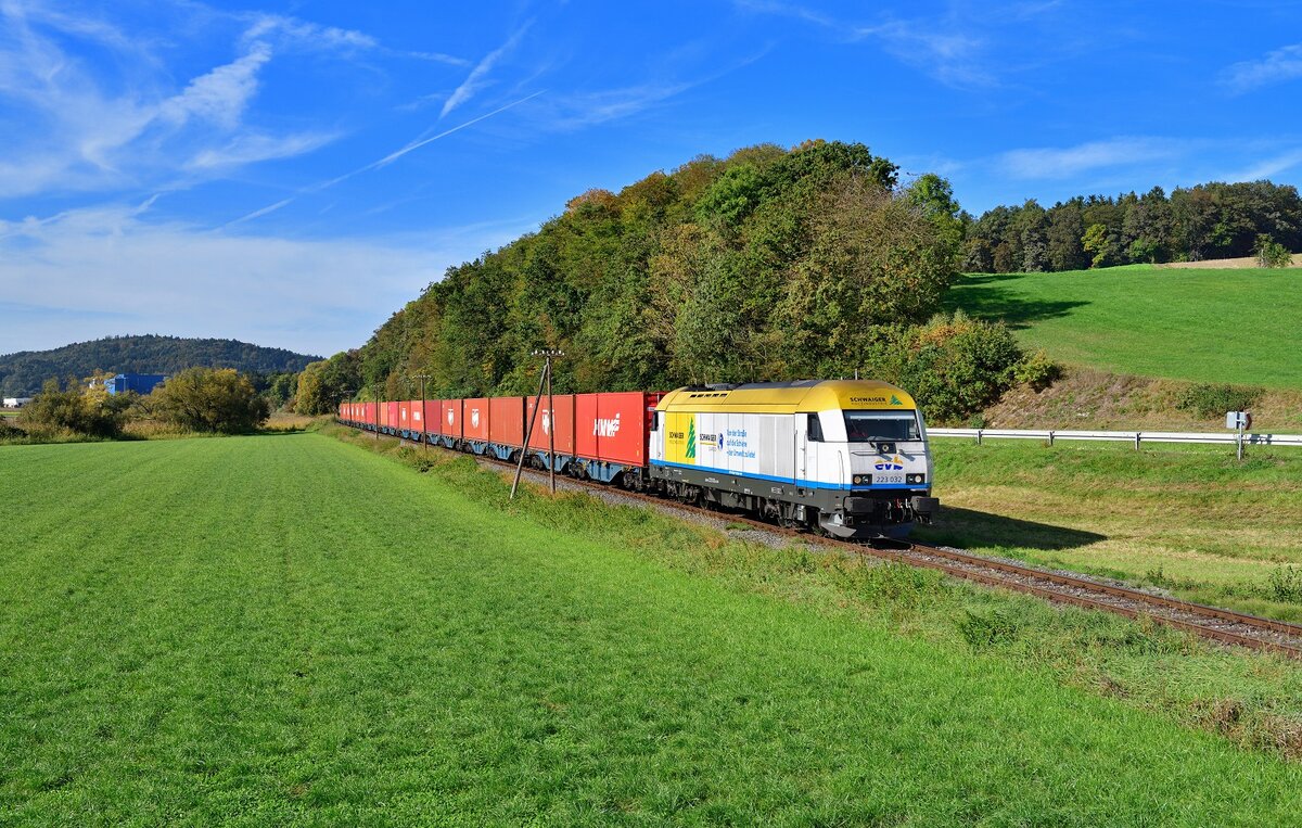 223 032 mit einem Containerzug am 13.10.2023 bei Hengersberg.