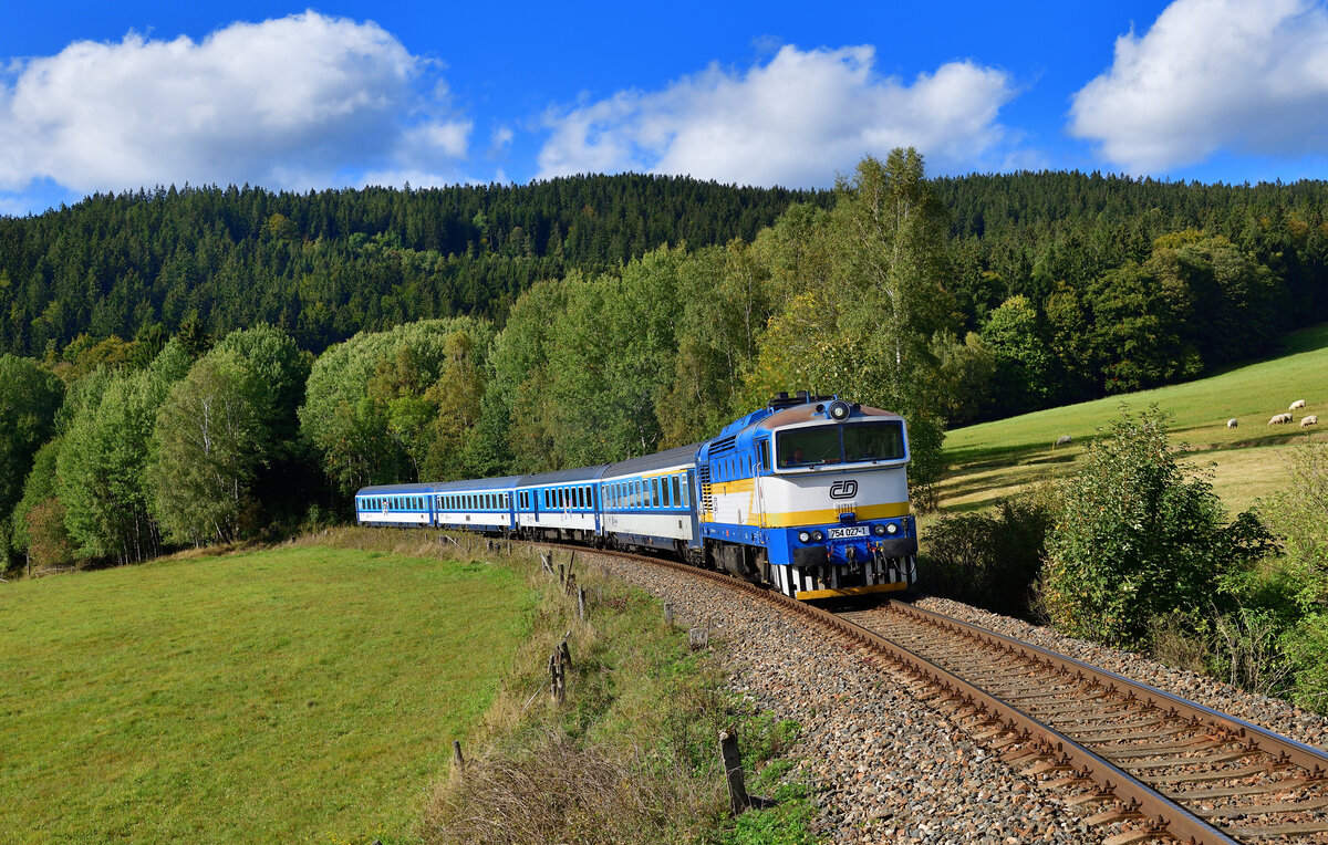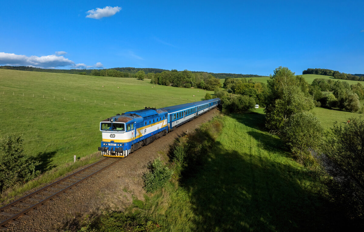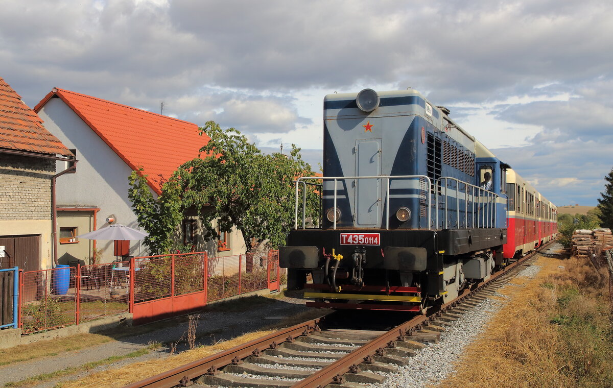 In den Monaten von O bis O fährt an den Wochenenden der Touristikzug von KZC von Prag bis Kralovice. Oft mit einer Bardotte 749, aber auch die 740 692 kommt ab und zu zum Einsatz dieses Zuges. Am 23.09.2023 konnten man den Zug mit dem Transistor nahe Kozlany kurz vor dem Ziel bei einem kleinen Sonnenfenster im dichten gewölkt aufnehmen.