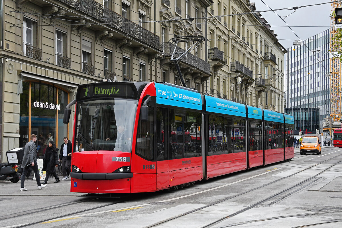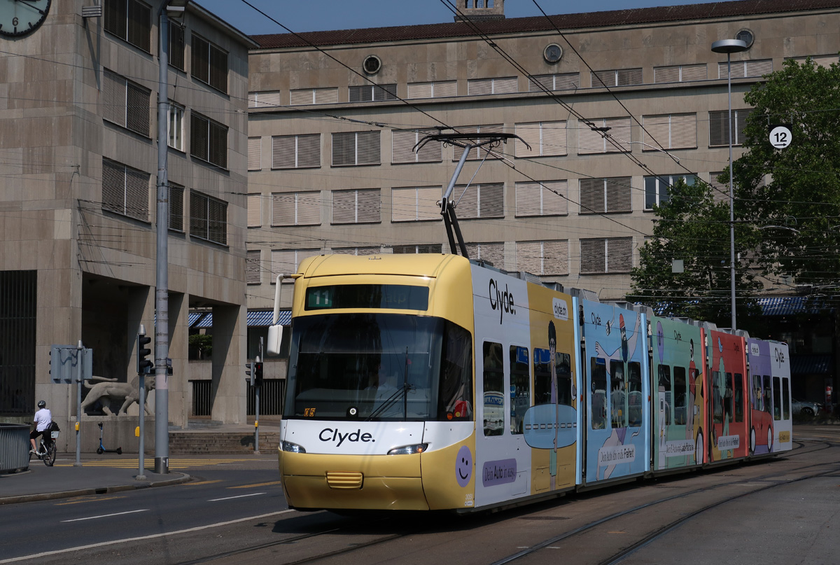 Be 6/8 Flexity "Federer Express", auf der Linie 2, bedient am 11.07.2023 die Haltestelle Gewerbeschule.