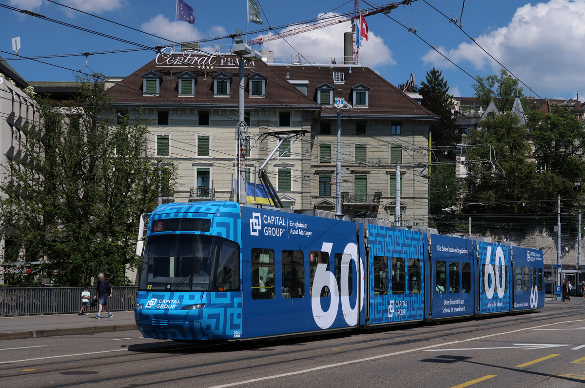 Be 6/8 Flexity  Federer Express , auf der Linie 2, bedient am 11.07.2023 die Haltestelle Gewerbeschule.