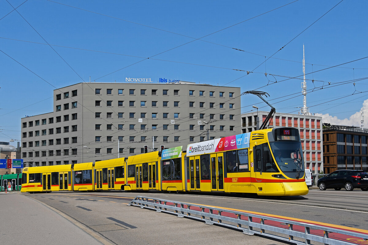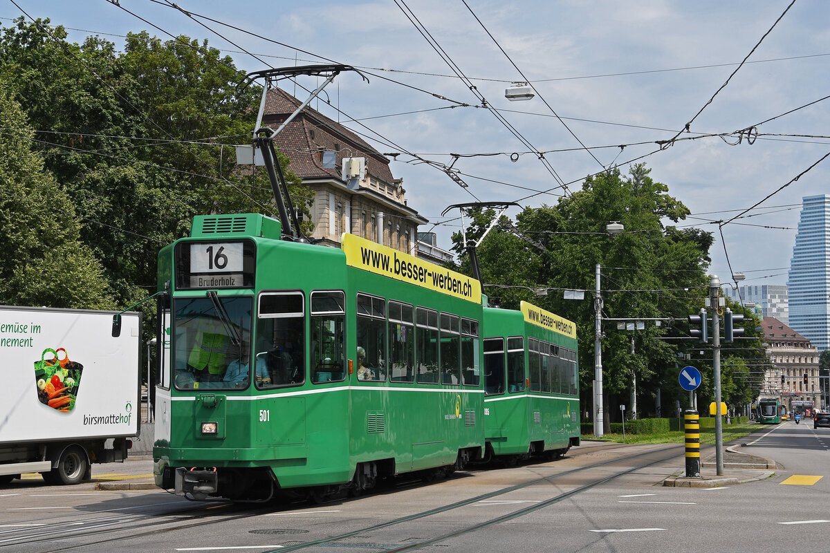 Doppeltraktion, mit den Be 4/4 501 und 495, auf der wegen der gesperrten Margarethenbrücke umgeleiteten Linie 16, fährt am 10.07.2023 zur Haltestelle am Bahnhof SBB.