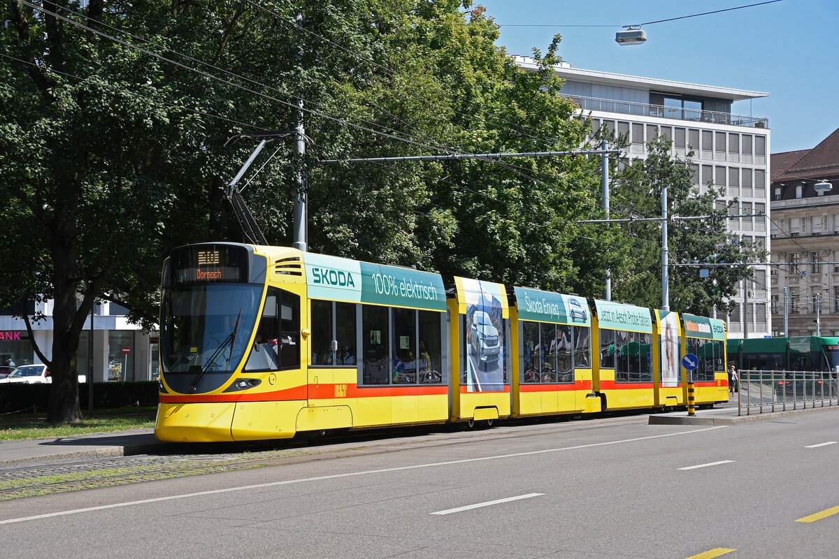 Be 6/8 Flexity 5037, auf der Linie 3, fährt am 10.07.2023 zur Haltestelle am Aeschenplatz.