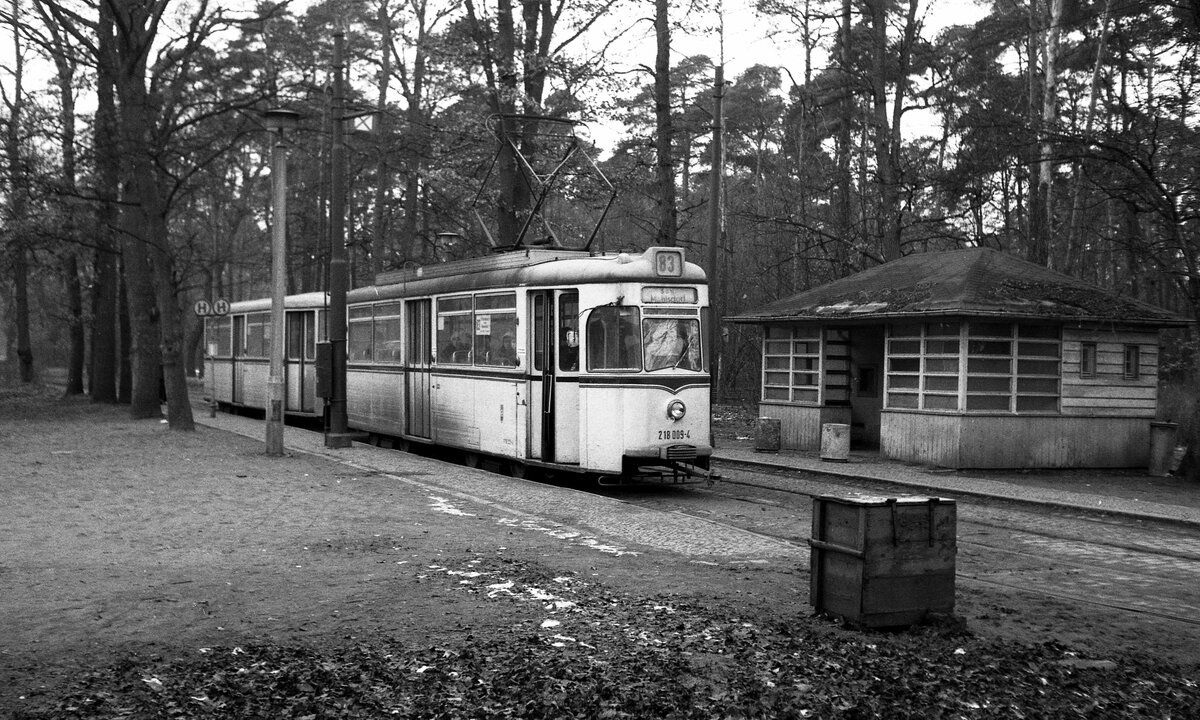 BVB Ost-Berlin__Zug der Linie 83 mit Tw 218 009-4 [TDE,WB Gotha 1962; +1989;lt.'berlin-straba.de'] in Richtung Mahlsdorf an der Haltestelle "Hubertus" in Mahlsdorf-Süd. (Danke, Lothar Weber, für die Lokalisierung !)__28-01-1978