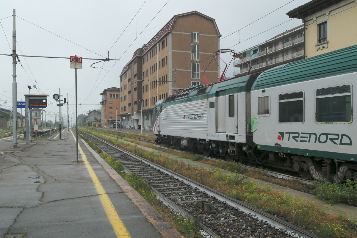Auf Gleis 1 steht die E464 239 der Trenord mit einem  Regionale  bereit zur Fahrt nach Milano Porta Garibaldi. Das regnerische, kühle Wetter in Piemont hat mich ein wenig erstaunt.