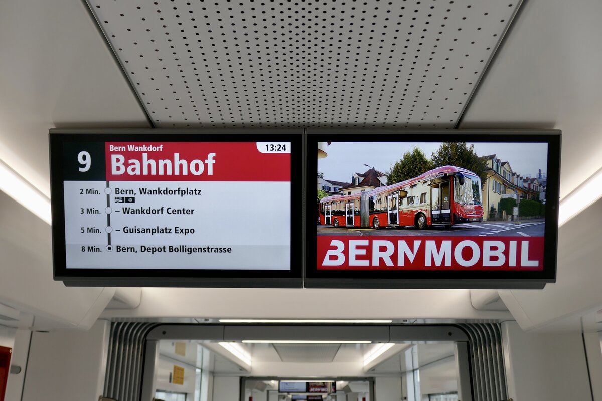 Ein Blick aufs Display im Innenraum des Stadler Tramlink 912 am 28.10.23 im Shuttle zum Depot Bolligenstrasse.