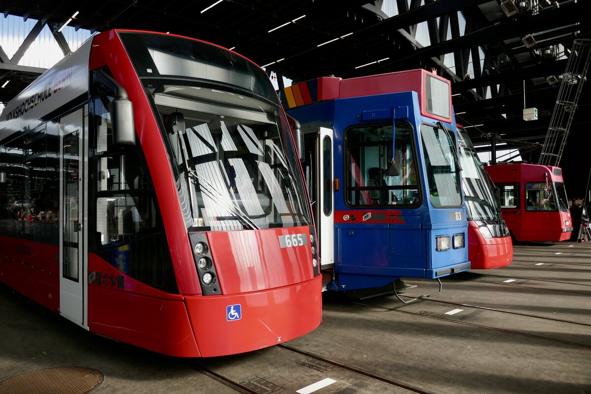 Fahrzeugparade am 28.10.23 im Depot Bolligenstrasse mit: Combino 655,  Blaue Bähnli  83, Tramlink 913 und Vevey Tram 742.