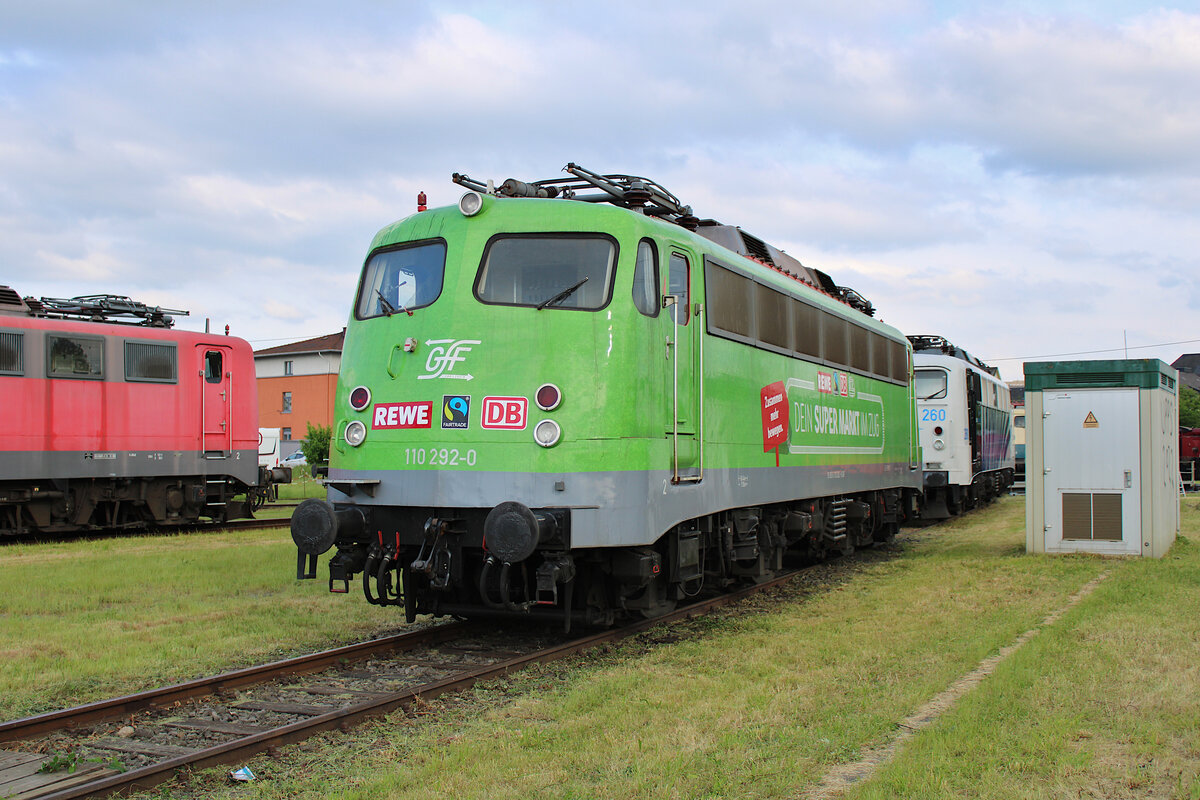 GfF 110 292-0 mit ihrer REWE-Beklebung steht als Gastlok an den Einheitsloktagen im DB Museum in Koblenz-Lützel ausgestellt. (20.05.2023)