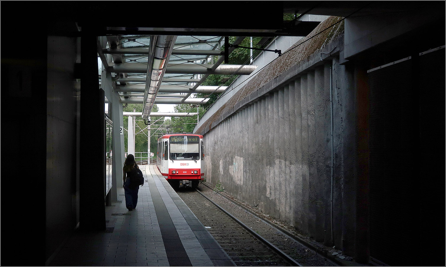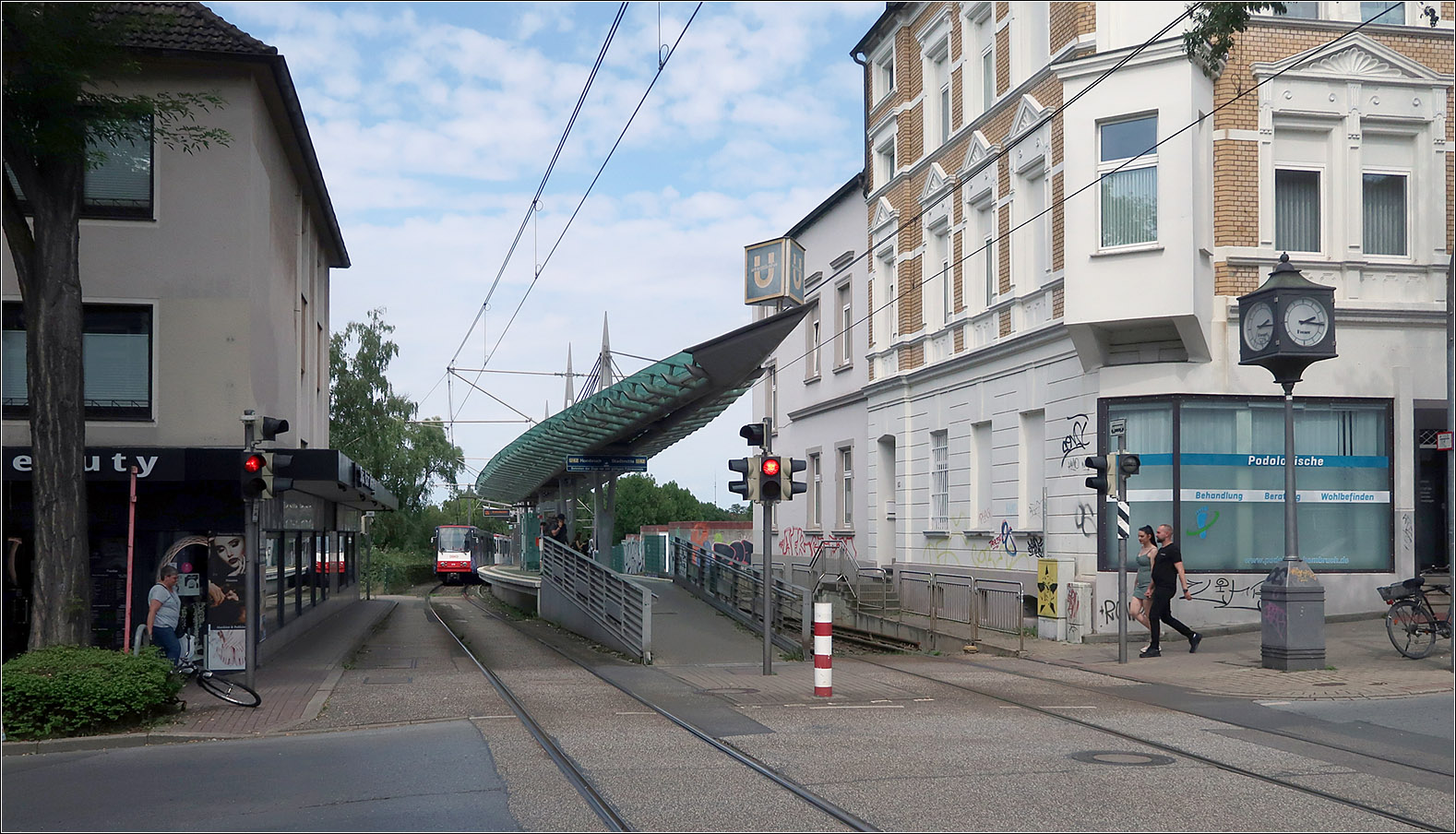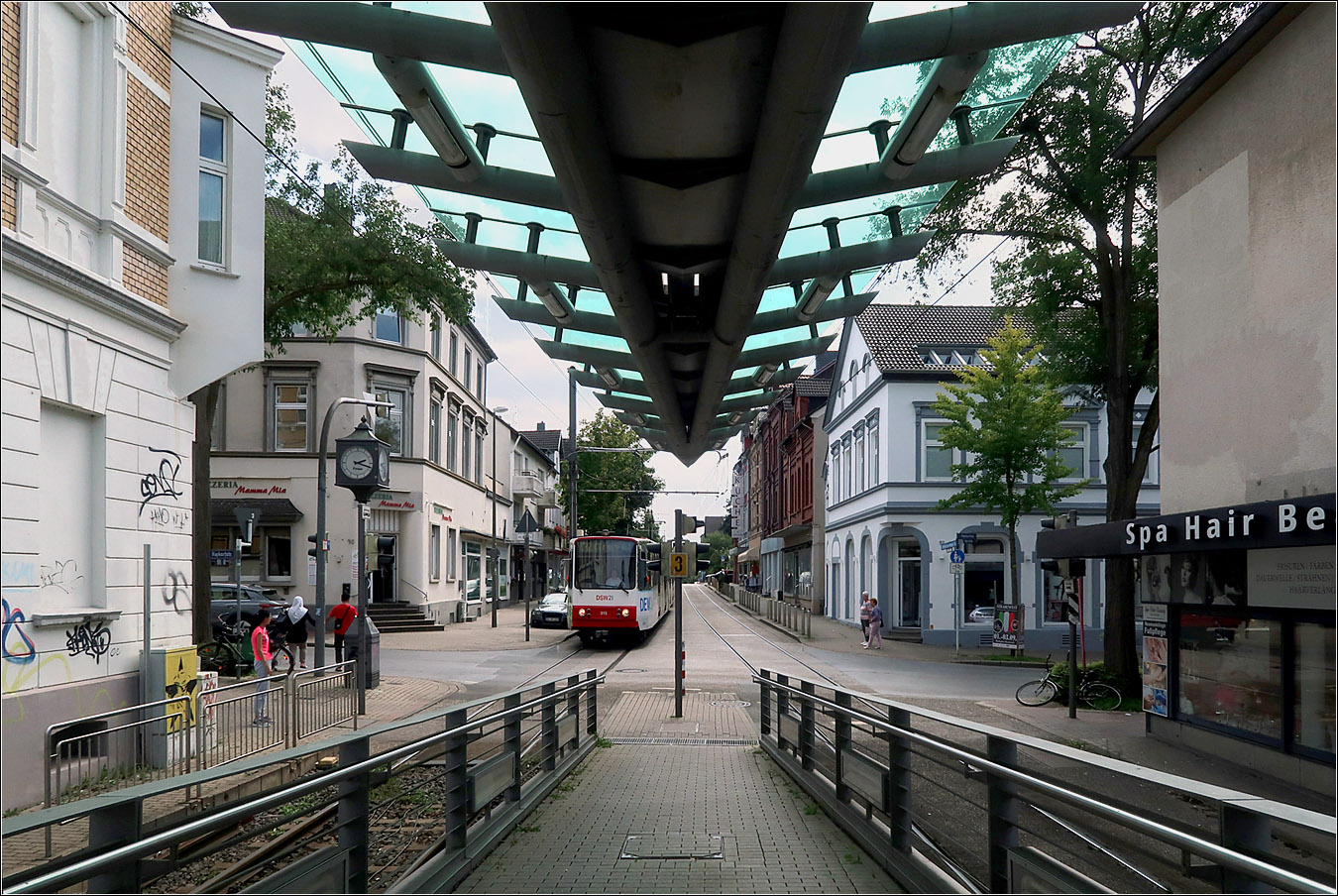 Die Haltestelle Harkortstraße hat eine interessante Überdachung, die bis über die Zugangsrampe auskragt. Hier endet auch wieder der eigene Bahnkörper und die Stadtbahnen fahren straßenbündig weiter durch die Deutsch-Luxemburger Straße.