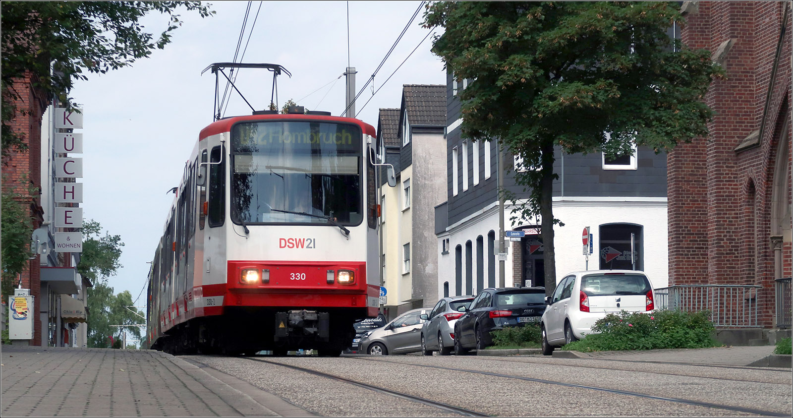 Eindrücke von der U42 in Dortmund - Weiter südlich lässt der Platz wieder einen eigenen Bahnkörper neben der Deutsch-Luxemburger Straße zu. Dort befindet sich dann auch die Haltestelle Hombruch Hallenbad. Die Strecke führt weiter in einem Rechtsbogen zur Endhaltstelle Grottenbachstraße. 21.08.2023 (M)