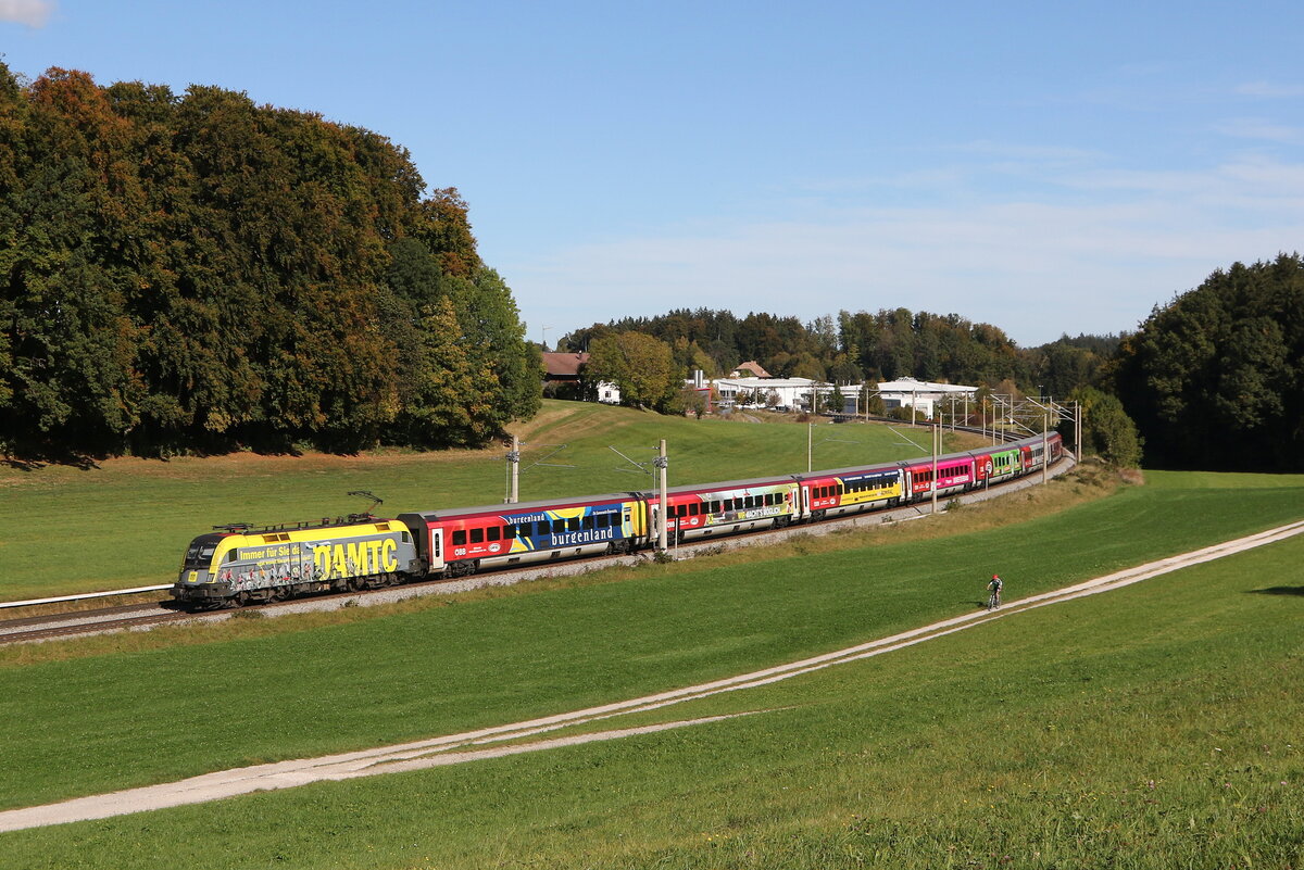 1116 153 "ÖAMTC" mit einem "Railjet" aus Salzburg kommend am 21. Oktober 2023 bei Axdorf.
