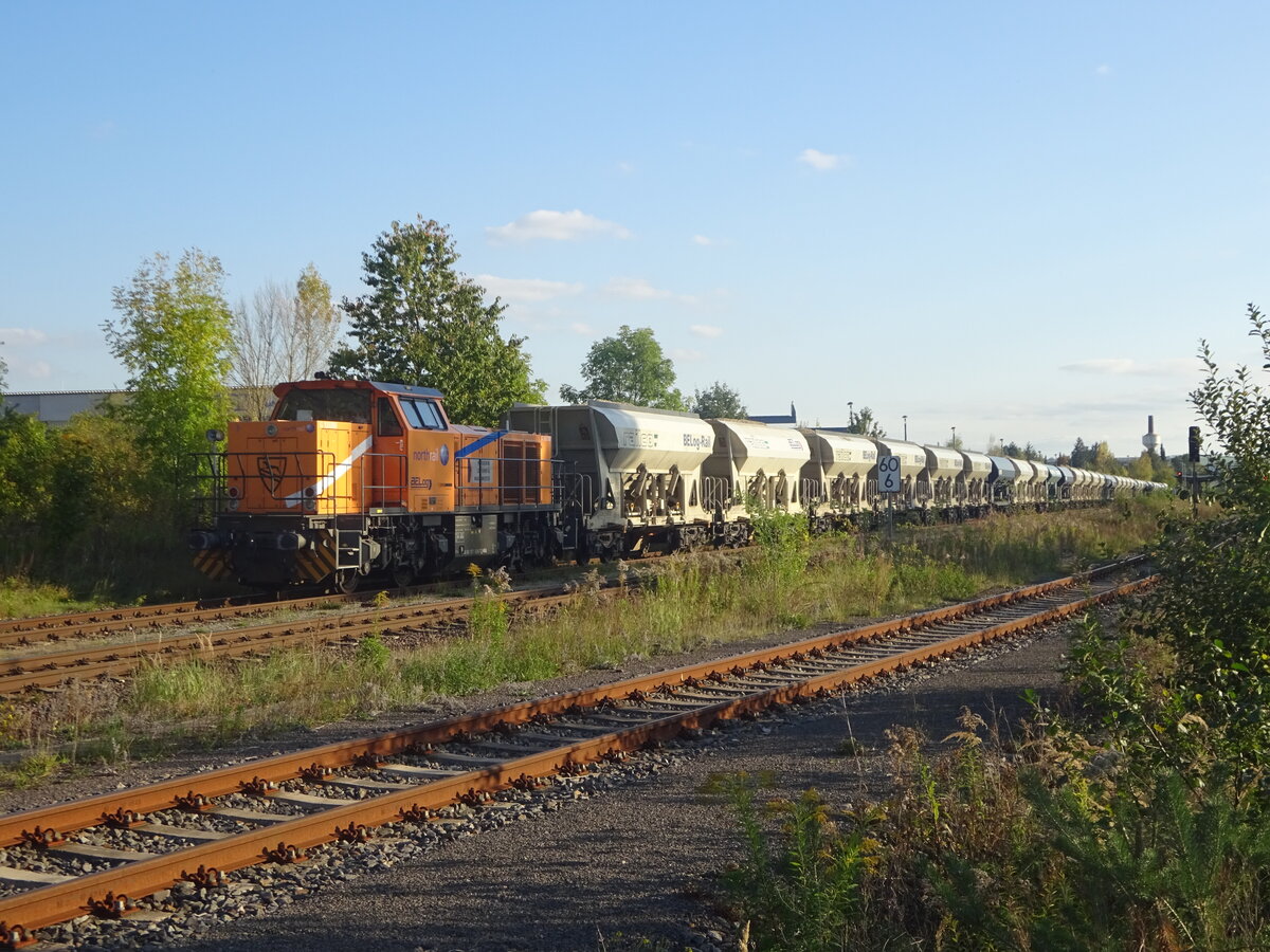271 026-7 der northrail stand für BELog am 17.10.2023 mit 33 Waggons in Crossen an der Elster. Ladegut war vermutlich Dolomit aus dem benachbarten Caaschwitz, wo das Wünschendorfer Dolomitwerk ein Bergwerk betreibt.