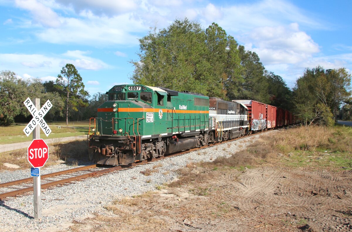 31.10.2023 Perry, FL. US Highway 98. 2 GP-40 (4007 + 4004 OMLX) der Georgia & Florida Railway mit paar Wagen
