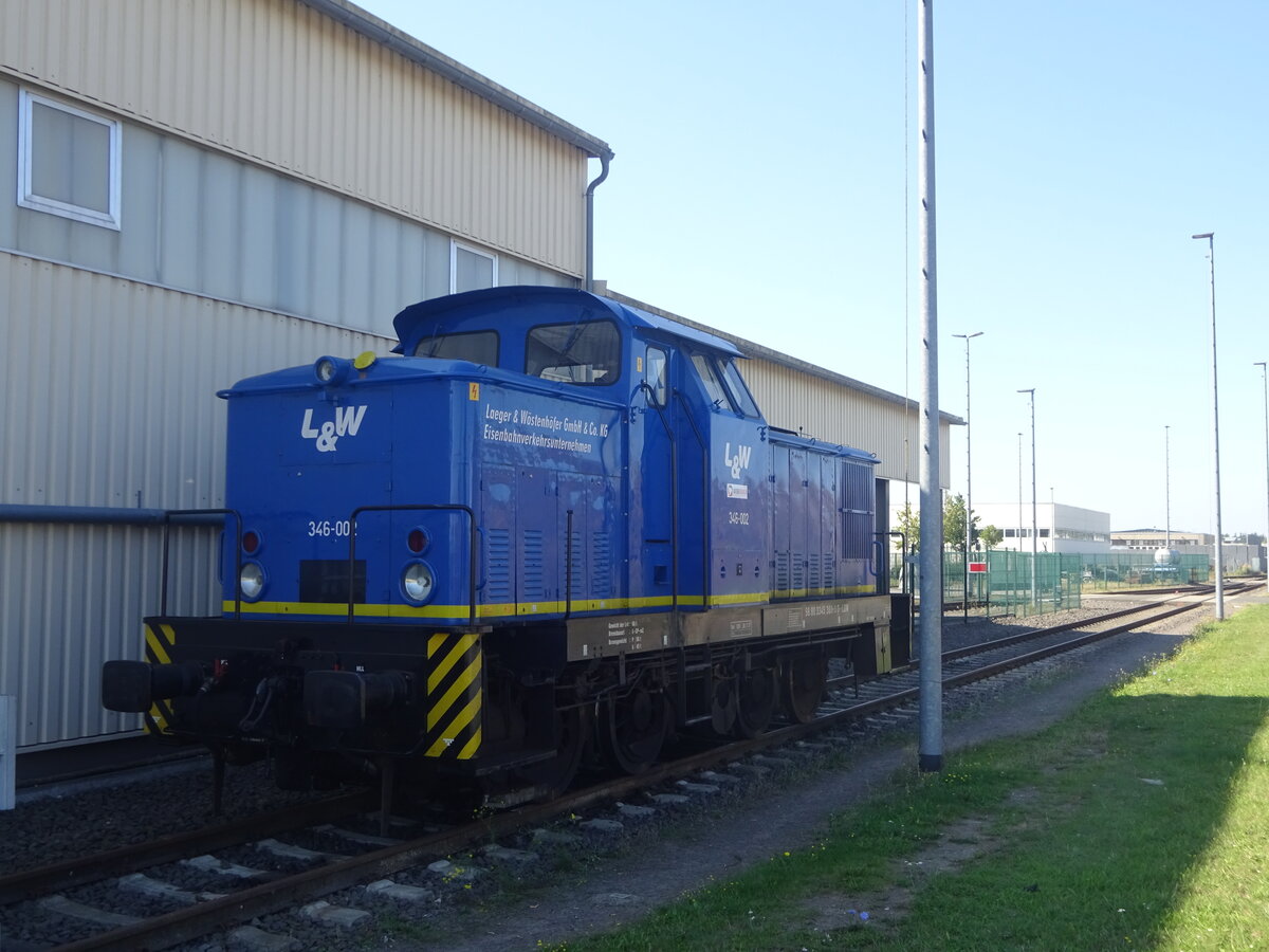 346 002 der Laeger & Wöstenhöfer GmbH & Co. KG stand am 10.09.2023 auf dem Gelände des Mercer Zellstoffwerkes in Arneburg bei Stendal. Auf dem Gelände war zu DDR-Zeiten das Kernkraftwerk Stendal im Bau, welches nach der Wende größtenteils wieder abgerissen wurde.