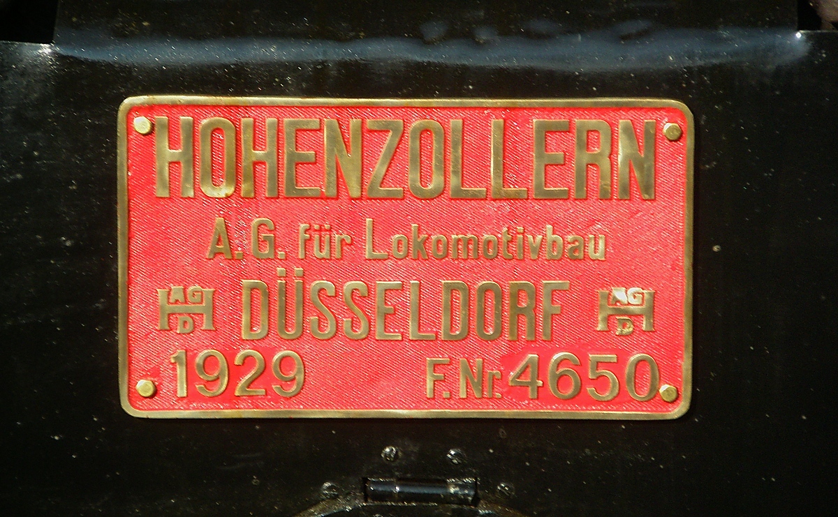 Fabrikschild der 80 039 (14.02.2009): Zwischen 1874 und 1929 lieferte die Lokomotivfabrik Hohenzollern AG insgesamt 4.665 Lokomotiven nicht nur nach Deutschland und Europa, sondern auch nach Japan, Rußland, Java, China, Brasilien und Paraguay. Die 80 039 gehört zu den letzten dort gefertigten Lokomotiven, noch im selben Jahr wurde die Lokomotivfabrik ein Opfer der Weltwirtschaftskrise.