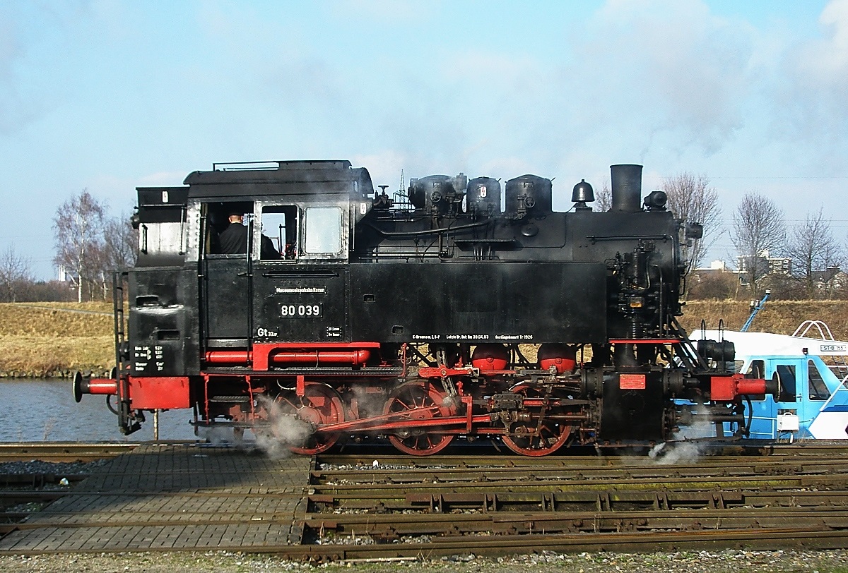 Während der Plandampfveranstaltung am 14.02.2009 pausieren die Lokomotiven 80 039 und Radbod der Museumseisenbahn Hamm im Hammer Hafengelände, ebenso wie die 80 039 ist auch die Radbod ein Produkt der Düsseldorfer Lokomotivfabrik Hohenzollern, ihr Baujahr ist allerdings schon 1906. Sie gehört zur Bauart "Crefeld C", einer leistungsstärkeren Variante der preußischen T 3.