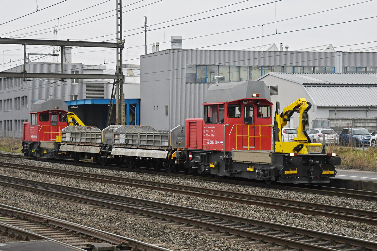 Abgestellt mit zwei Flachwagen ist die Köf 4607 (322 660-2 | 321 611-6 | Kö 4607) im Bahnhof Fützen.