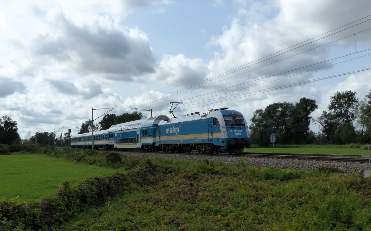 Normalerweise fahren RheinCargo-Lokomotiven nur Güterzüge durchs Land, im Oktober 2023 ist die RHC 145 086-5 aber an die Wedler Franz Logistik (WFL) vermietet und wird von ihr mit einem "Kamelzug" (n-Wagen und ein exDR-Dosto) im RE80-Ersatzverkehr eingesetzt, wie die Aufnahme bei Kilometer 83,0 in Steinach bei Rothenburg ob der Tauber zeigt.