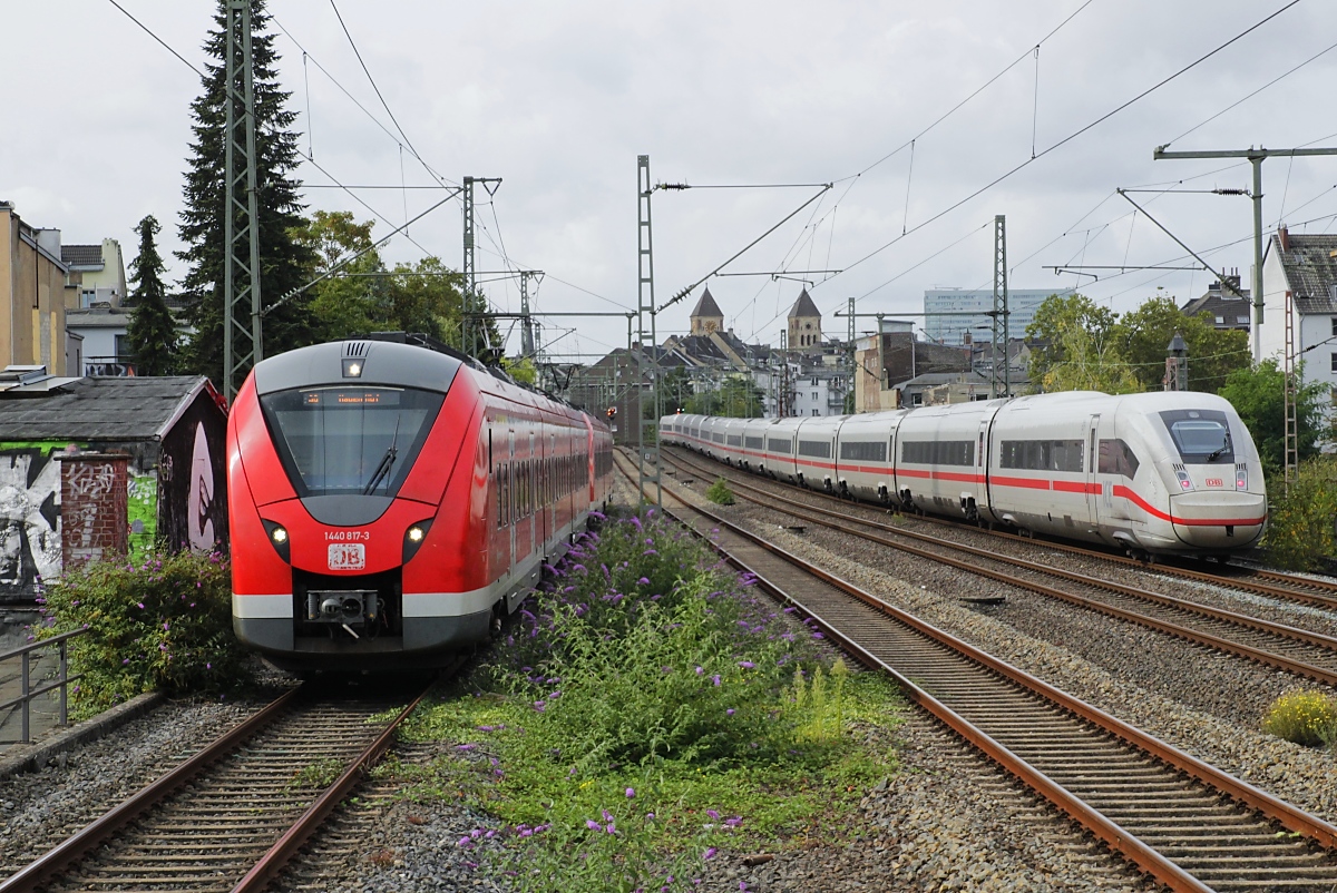 Diese Begegnung in Düsseldorf-Flingern am 04.10.2023 zwischen dem 1440 817-3 als S 8 von Mönchengladbach nach Hagen und einem 412 mit dem ICE 519 (Hamburg-Altona - München Hbf.) ist nur während der Herbstferien in NRW möglich, da einige ICE in diesem Zeitraum wegen der Streckensperrung zwischen Mülheim (Ruhr) und Duisburg Hbf. über die Wupperscheine verkehren