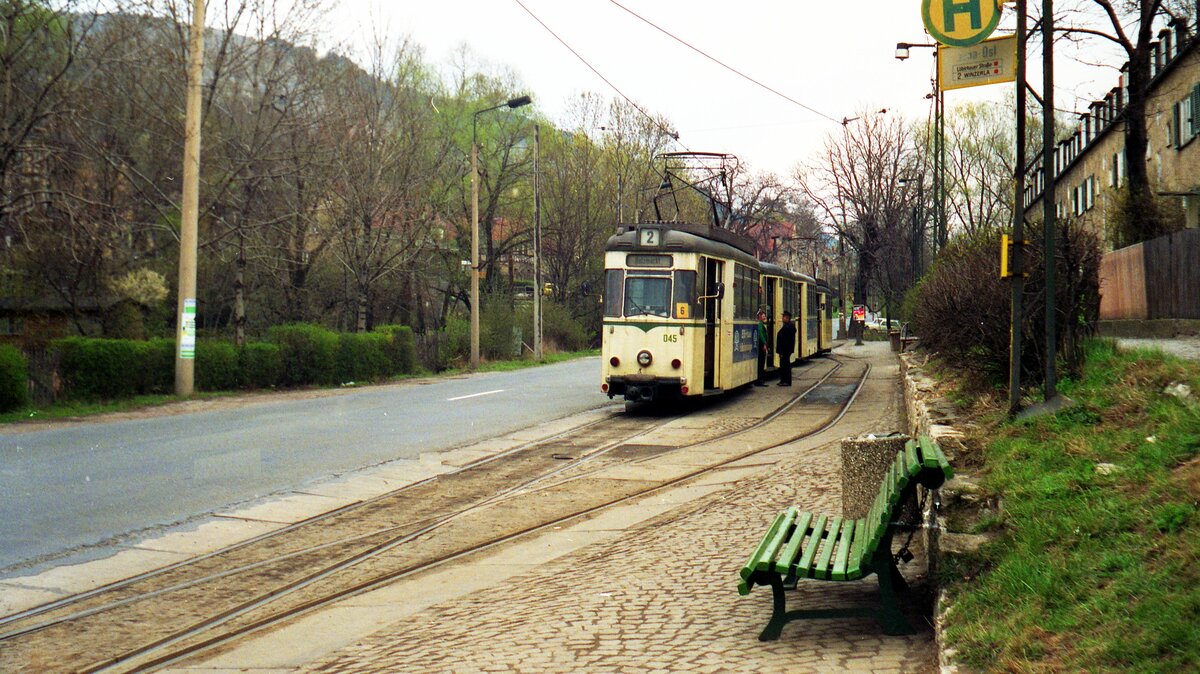 Straßenbahn Jena__Linie 2 mit Tw 045 an der Endstelle 'Jena-Ost' mit Stand-Tw.__17-03-90