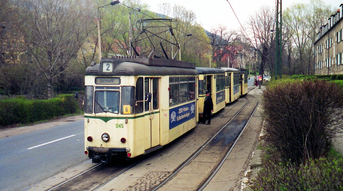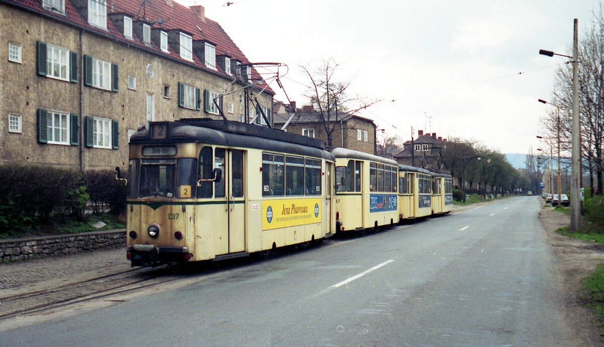 Straßenbahn Jena__Linie 2 in der Karl-Liebknecht-Straße.__17-03-90