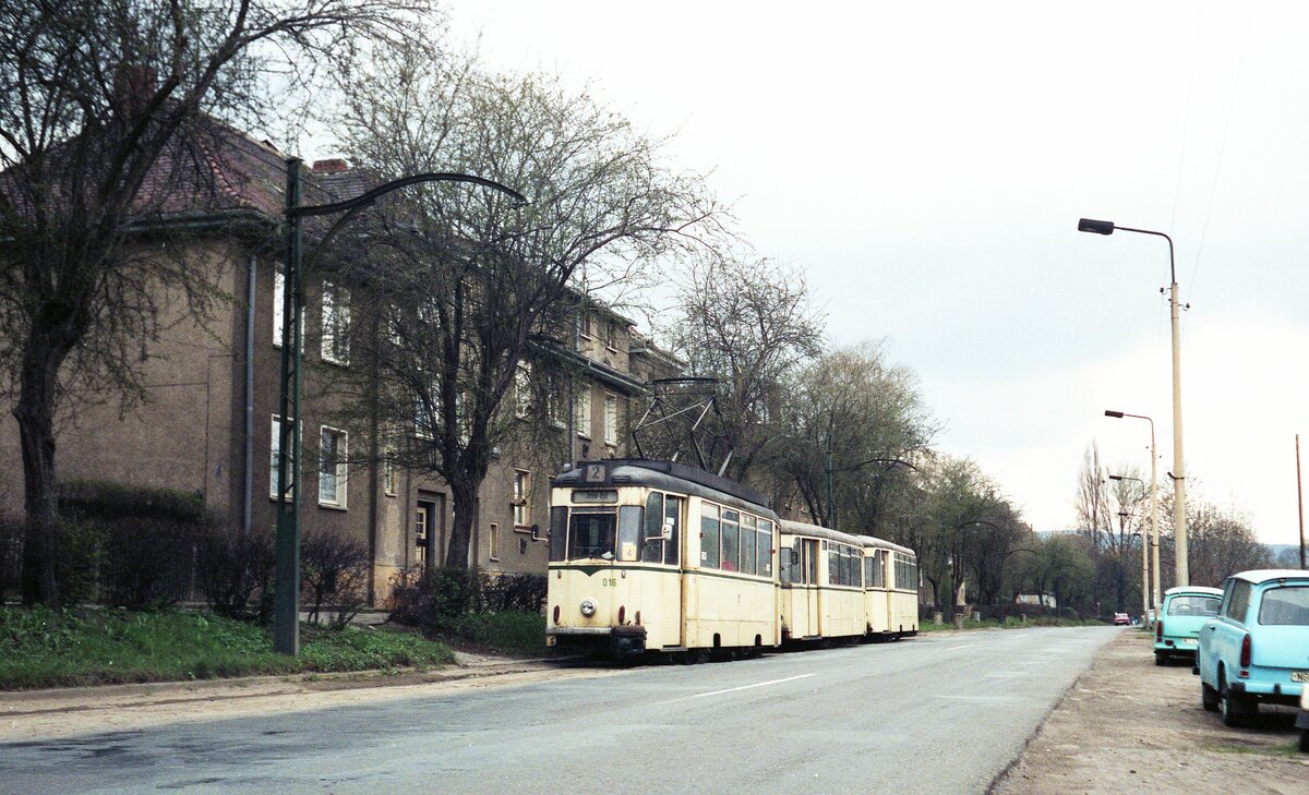 Straßenbahn Jena__Zweiwagen-Zug der Linie 2 mit Bw 147 [BZ70, RAW Sw 1972; 2001> Naumburg] nach Jena-Ost__17-03-90