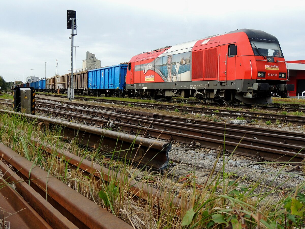 2016 910-9  Erika  ist mit Rübenzug 59085 wieder auf Schiene, und wartet am Bhf. Ried mit 18Wagen auf die Abfahrt Richtung Zuckerfabrik; 231009