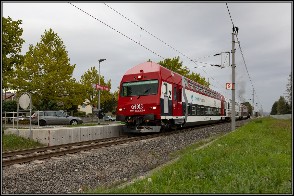 9.Oktober 2023 . Vor 30ig Jahren war die GKB einmal mehr Vorreiter in Österreich bei Schienenfahrzeugen mit der beschaffung der damals in Hierzulande einzigartigen Doppelstockwagen. In den letzten Wochen erhielt der Steuerwagen "BS 203" Einen Neulack im S-Bahn Design. Hier in der Haltestelle Pölfng Brunn auf dem Weg nach Wies Eibiswald.