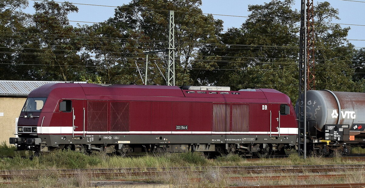 DeltaRail GmbH, Frankfurt (Oder) mit ihrer  223 154  (NVR:  92 80 1223 154-6 D-DELTA) und einem Kesselwagenzug Höhe Bahnhof Frankfurt (Oder) am 11.10.23