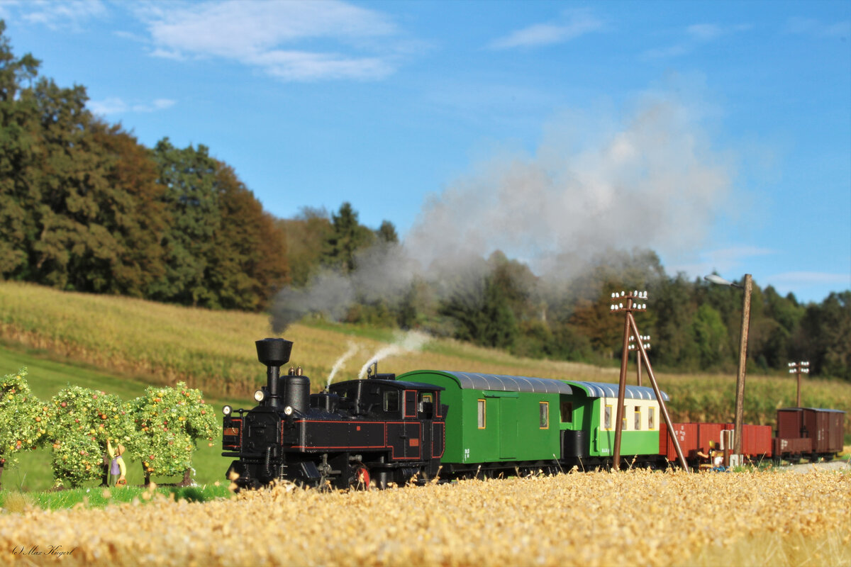In den letzten Wochen erhielt der Steuerwagen  BS 203  Einen Neulack im S-Bahn Design. Hier in der Haltestelle Pölfng Brunn auf dem Weg nach Wies Eibiswald.