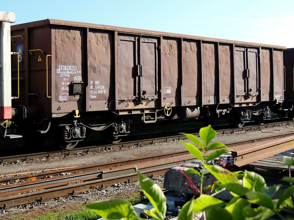Eaos 31 81 5334 068-4-8 ist im Rübenleerzug eingereiht, und wartet am Bhf. Ried zur Weiterfahrt; 231009