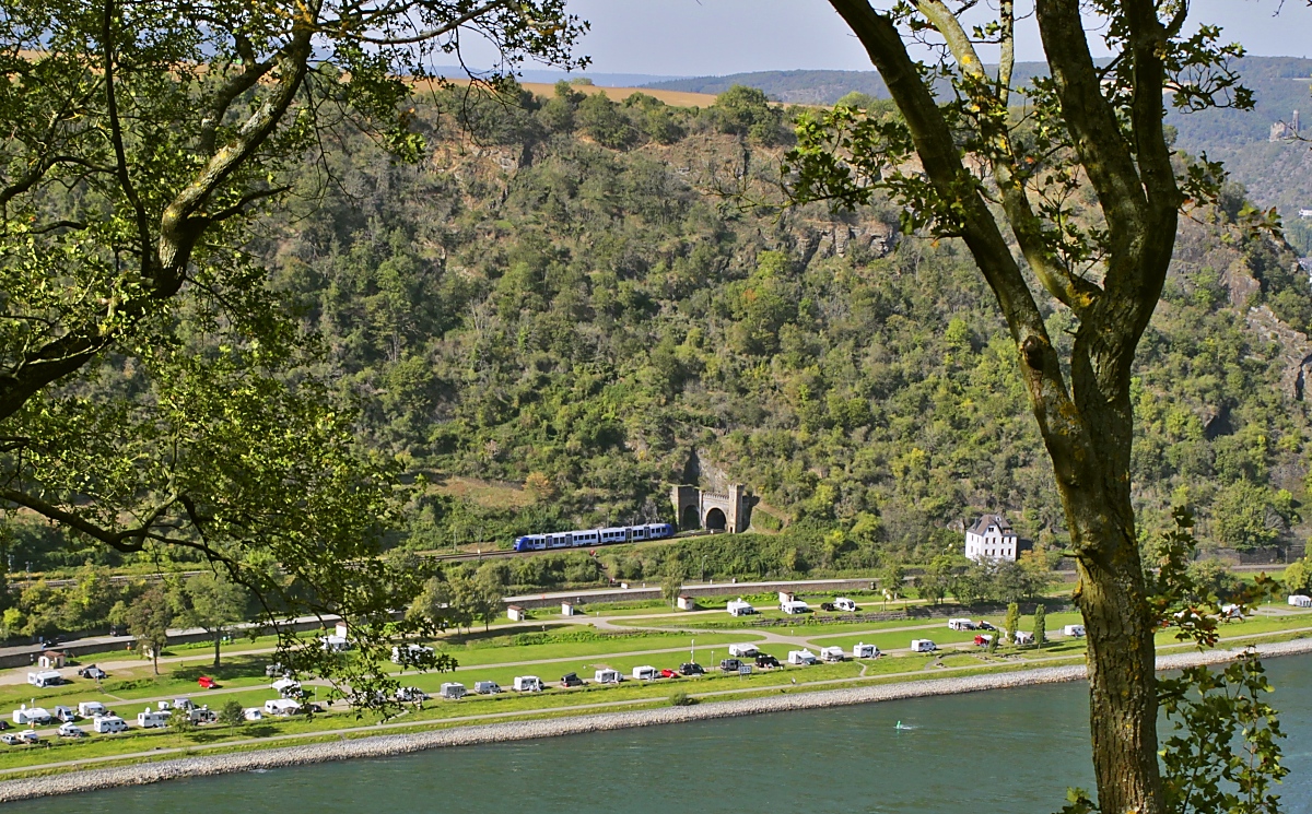 Ein Blick vom Loreleyfelsen auf die linke Rheinstrecke: Am 11.10.2023 wird ein 460 der Mittelrheinbahn auf dem Weg von Mainz nach Koblenz gleich in den Banktunnel einfahren. Die Wohnmobile auf dem Campingplatz dürften in der Mehrzahl gelbe Nummernschider haben...