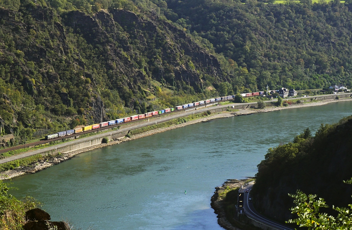 Zwischen Kaub und St. Goarshausen ist am 11.10.2023 eine 185 mit einem Containerzug auf der rechten Rheinstrecke unterwegs nach Norden. Unterhalb des Loreleyfelsens befindet sich die engste Stelle des Mittelrheintals, der Fluss ist an dieser Stelle rund 25 m tief. Der etwa 7 km lange Rheinabschnitt zwischen Oberwesel und Sankt Goar ist sehr schmal, hat eine starke Strömung und weist einige Untiefen sowie enge Kurven auf. Seit Mitte des 19. Jahrhunderts warnen daher spezielle Wahrschaustationen den Schiffsverkehr vor Gefahren. Bis 1972 geschah dies durch Flaggen-, seitdem durch Lichtsignalanlagen. Auf dem Bild ist unten rechts zwischen Straße und Fluss die Signalstelle  Bankeck  erkennbar. Der  schräge untere Balken zeigt an, dass auf dem folgenden Abschnitt ein Einzelfahrer bis 110 m Länge zu erwarten ist.