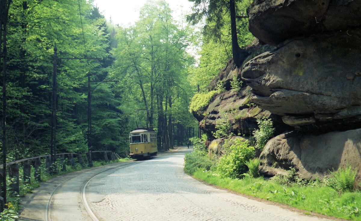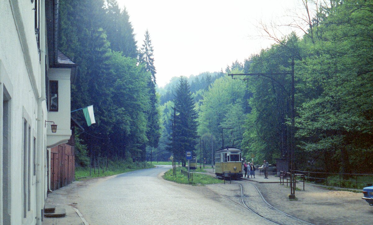 Kirnitzschtalbahn__Tw 5 [T2, Gotha 1943, ex Lockwitztalbahn] an der Endstation 'Lichtenhainer Wasserfall'.__11-05-1990